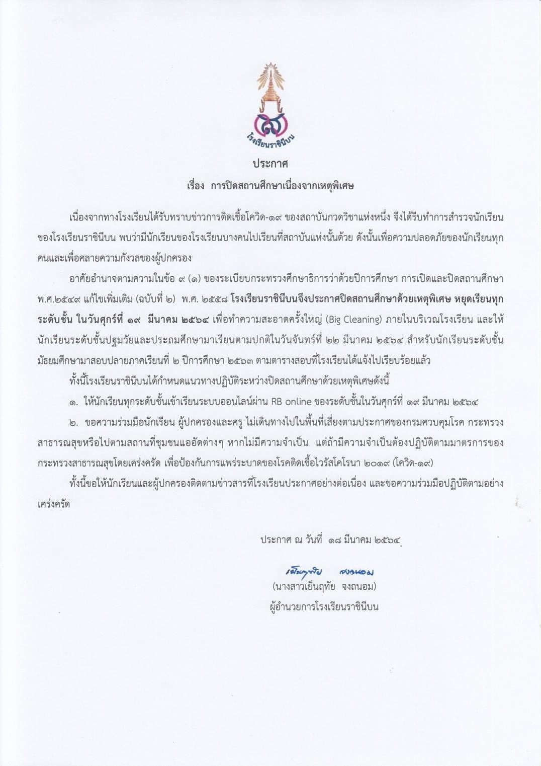 ทั้งนี้โรงเรียนราชินีบนได้กำหนดแนวทางปฏิบัติระหว่างปีดสถานศึกษาด้วยเหตุพิเศษดังนี้