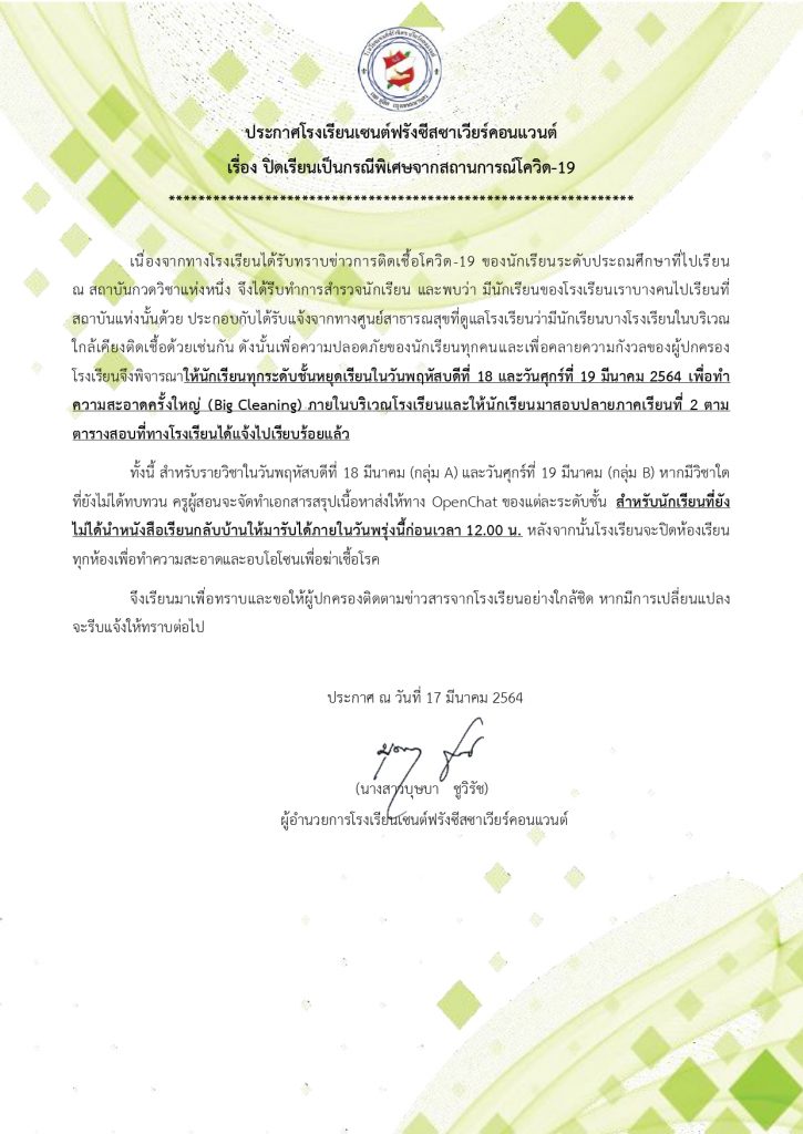 ขณะที่ก่อนหน้านี้ รร.เซนต์ฟรังซีสซาเวียร์คอนแวนต์ ได้ออกประกาศ เรื่อง ปิดเรียนเป็นกรณีพิเศษจากสถานการณ์โควิด-19 เนื่องจากทางโรงเรียนได้รับทราบข่าวการติดเชื้อโควิด -19 ของนักเรียนระดับประถมศึกษาที่ไปเรียน ณ สถาบันกวดวิชาแห่งหนึ่ง จึงได้รีบทำการสำรวจนักเรียน และพบว่ามีนักเรียนของโรงเรียนเราบางคนไปเรียนที่สถาบันแห่งนั้นด้วย ประกอบกับได้รับแจ้งจากทางศูนย์สาธารณสุขที่ดูแลโรงเรียนว่ามีนักเรียนบางโรงเรียนในบริเวณใกล้เคียงติดเชื้อด้วยเช่นกัน ดังนั้น เพื่อความปลอดภัยของนักเรียนทุกคนและเพื่อคลายความกังวลของผู้ปกครองโรงเรียนจึงพิจารณาให้นักเรียนทุกระดับชั้นหยุดเรียนในวันพฤหัสบดีที่ 18 และวันศุกร์ที่ 19 มีนาคม 2564 เพื่อทำ ความสะอาดครั้งใหญ่ (Big Cleaning) ภายในบริเวณโรงเรียนและให้นักเรียนมาสอบปลายภาคเรียนที่ 2 ตามตารางสอบที่ทางโรงเรียนได้แจ้งไปเรียบร้อยแล้ว