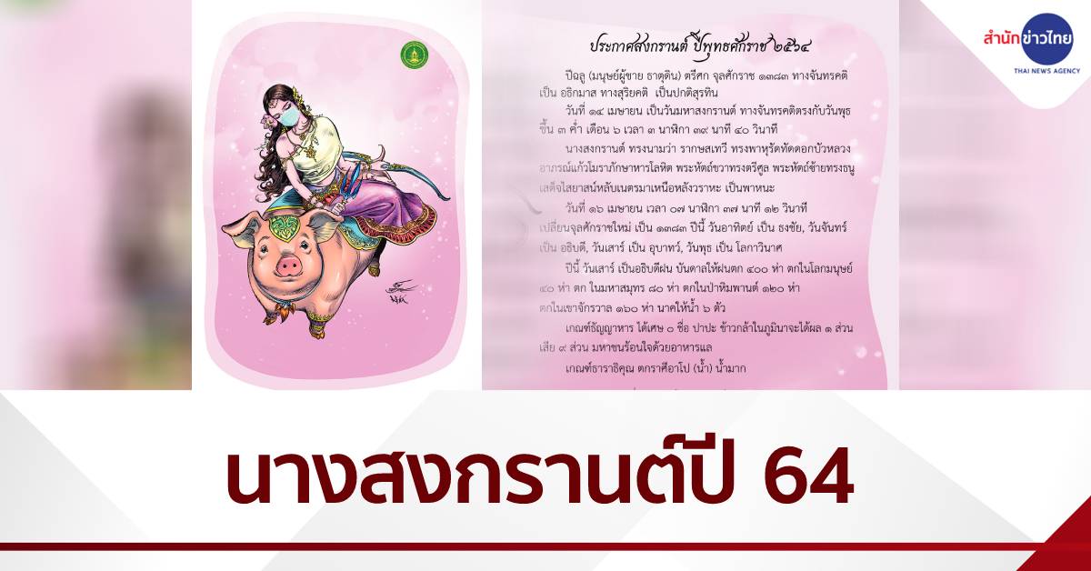 กรมส่งเสริมวัฒนธรรม กระทรวงวัฒนธรรม จัดทำภาพวาดนางสงกรานต์ ประจำปี 2564 พร้อมเผยแพร่ประกาศสงกรานต์ของฝ่ายโหรพราหมณ์ กองพระราชพิธี สำนักพระราชวัง ดังนี้ ปีฉลู (มนุษย์ผู้ชาย ธาตุดิน) ตรีศก จุลศักราช 1383 ทางจันทรคติ เป็น อธิกมาส ทางสุริยคติ เป็นปกติสุรทิน วันที่ 14 เมษายน เป็น วันมหาสงกรานต์ ทางจันทรคติตรงกับวันพุธ ขึ้น 3 ค่ำ เดือน 6 เวลา 3 นาฬิกา 39 นาที 40 วินาที