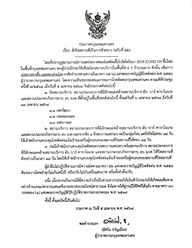 ⁃ ให้ปิดสถานบริการ สถานประกอบการที่มีลักษณะคล้ายสถานบริการ ผับ บาร์ คาราโอเกะ ทุกแห่งในพื้นที่เขตวัฒนาและเขตคลองเตย ซึ่งเป็น Cluster ย่านทองหล่อ