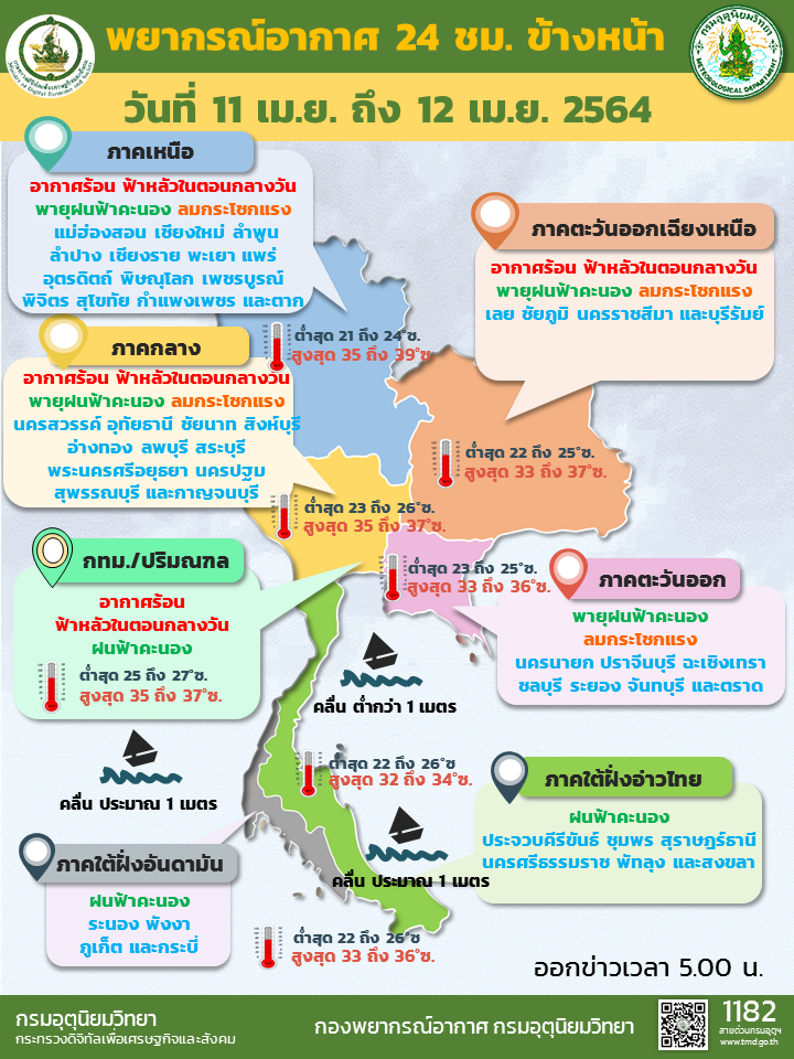 กรมอุตุนิยมวิทยา พยากรณ์อากาศ 24 ชั่วโมงข้างหน้า บริเวณความกดอากาศสูงหรือมวลอากาศเย็นกำลังปานกลางจากประเทศจีนยังคงปกคลุมภาคตะวันออกเฉียงเหนือของประเทศไทยและทะเลจีนใต้ ทำให้ลมใต้และลมตะวันออกเฉียงใต้ที่พัดปกคลุมภาคเหนือตอนล่าง ภาคตะวันออกเฉียงเหนือตอนล่าง ภาคกลางภาคตะวันออก รวมทั้งกรุงเทพมหานครและปริมณฑล ในขณะที่บริเวณประเทศไทยตอนบนยังคงมีอากาศร้อน ลักษณะเช่นนี้ทำให้บริเวณประเทศไทยตอนบนมีพายุฝนฟ้าคะนองและลมกระโชกแรงเกิดขึ้นได้ในบางพื้นที่ สำหรับลมตะวันออกที่พัดปกคลุมอ่าวไทยและภาคใต้มีกำลังแรงขึ้น ทำให้บริเวณภาคใต้ยังคงมีฝนฟ้าคะนองบางแห่ง