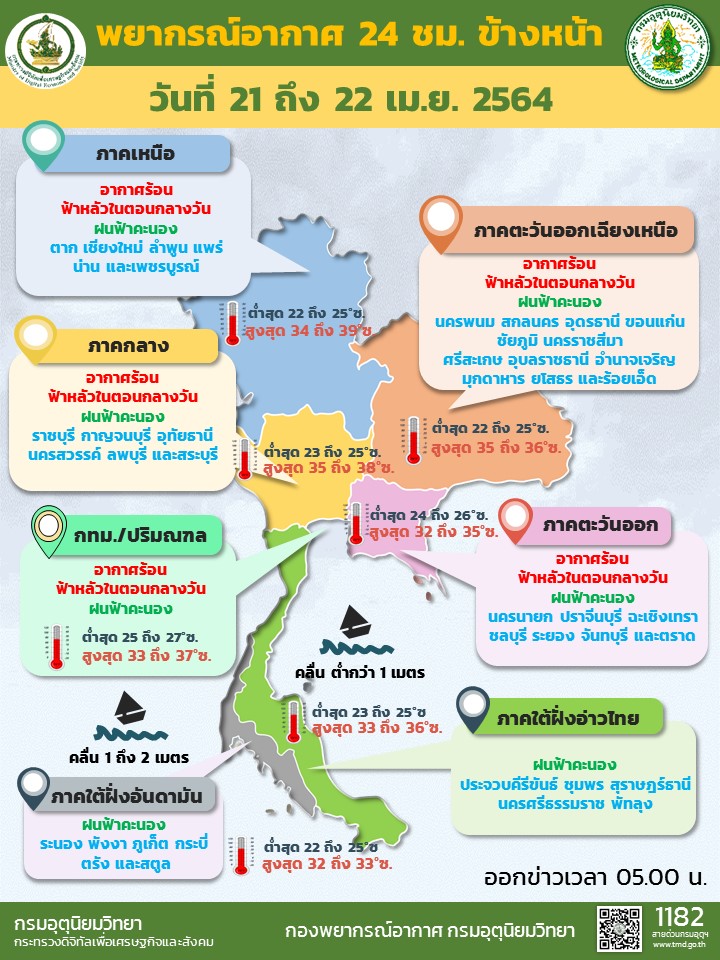 กรมอุตุฯ 21 เม.ย. – กรมอุตุฯ เผยทั่วไทยอากาศร้อน และยังคงมีฝนฟ้าคะนองในภาคอีสาน ภาคกลาง ภาคตะวันออก รวมทั้งกรุงเทพฯ ปริมณฑล และภาคใต้