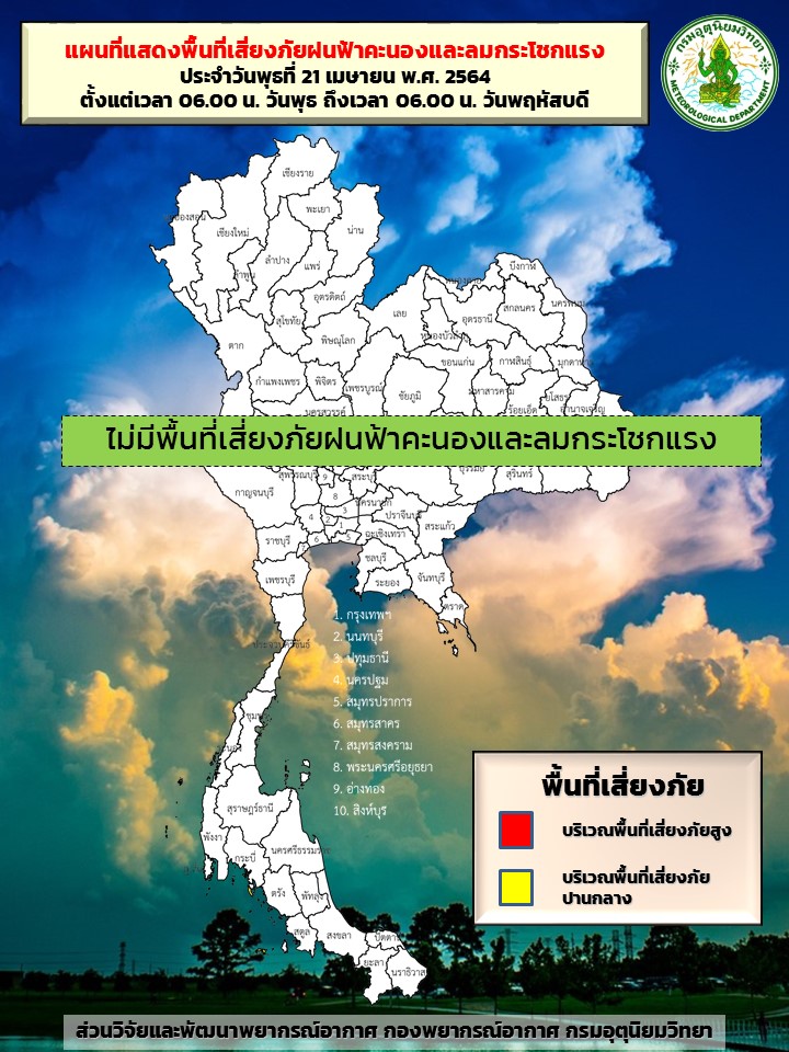 กรมอุตุนิยมวิทยา พยากรณ์อากาศ 24 ชั่วโมงข้างหน้า ความกดอากาศต่ำเนื่องจากความร้อนปกคลุมประเทศไทยตอนบน ลักษณะเช่นนี้ทำให้ประเทศไทยมีอุณหภูมิสูงขึ้น กับมีอากาศร้อนในตอนกลางวัน ในขณะที่มีลมตะวันตกเฉียงใต้พัดนำความชื้นจากทะเลอันดามันและอ่าวไทย เข้ามาปกคลุมภาคตะวันออกเฉียงเหนือ ภาคกลาง ภาคตะวันออก รวมทั้งกรุงเทพมหานคร และปริมณฑล และภาคใต้ ลักษณะเช่นนี้ทำให้บริเวณดังกล่าวยังคงมีฝนฟ้าคะนองเกิดขึ้นได้ ขอให้ประชาชนบริเวณดังกล่าวระมัดระวังอันตรายจากฝนฟ้าคะนองไว้ด้วย