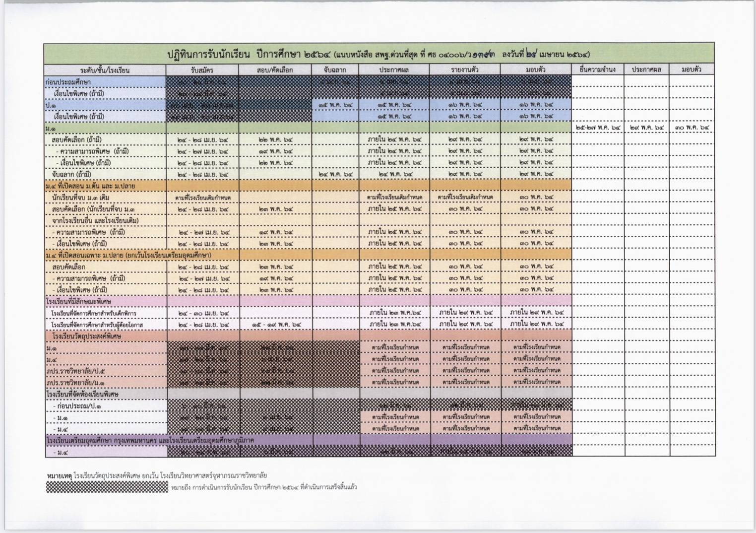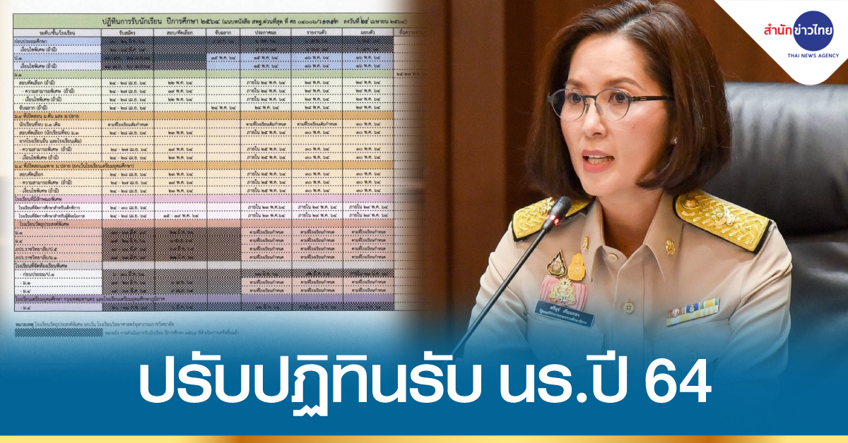 ด้าน ดร.อัมพร พินะสา เลขาธิการคณะกรรมการการศึกษาขั้นพื้นฐาน (กพฐ.) กล่าวว่า สพฐ.ได้ปรับปรุงปฏิทินการรับนักเรียน ปีการศึกษา 2564 (ฉบับใหม่กรณีเปิดเทอม 1 มิ.ย.64) โดยปรับตามสถานการณ์การแพร่ระบาดของโควิด-19 จึงได้เลื่อนจากปฏิทินเดิม 2 สัปดาห์ ดังนี้ ชั้นประถมศึกษาปีที่ 1 เลื่อนการจับสลากและประกาศผล เป็นวันที่ 15 พ.ค. รายงานตัว-มอบตัววันที่ 16 พ.ค. มัธยมศึกษาปีที่ 1 เลื่อนวันสอบเป็นวันที่ 22 พ.ค. คัดเลือกความสามารถพิเศษวันที่ 19 พ.ค. จับสลากจากวันที่ 24 พ.ค. ประกาศผลภายในวันที่ 24 พ.ค. และมอบตัววันที่ 29 พ.ค. ส่วนชั้นมัธยมศึกษาปีที่ 4 เลื่อนวันสอบเป็นวันที่ 23 พ.ค. คัดเลือกความสามารถพิเศษวันที่ 19 พ.ค. ประกาศผลวันที่ 25 พ.ค. รายงานและมอบตัวพร้อมกันวันที่ 30 พ.ค. โรงเรียนที่มีลักษณะพิเศษที่จัดสอนสำหรับเด็กพิการ/ผู้ด้อยโอกาส รับสมัครวันที่ 24-30 เม.ย. สอบ/คัดเลือกวันที่ 15-19 พ.ค. ประกาศผลวันที่ 23 พ.ค. รายงานตัวและมอบตัวภายในวันที่ 29 พ.ค. ทั้งนี้ ผู้ที่ยังไม่มีที่เรียนยื่นความจำนงได้ในวันที่ 25-27 พ.ค. ประกาศผลวันที่ 29 พ.ค. และมอบตัววันที่ 30 พ.ค.64