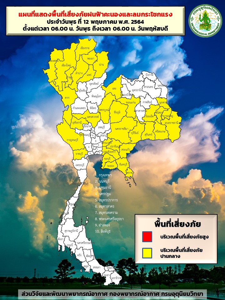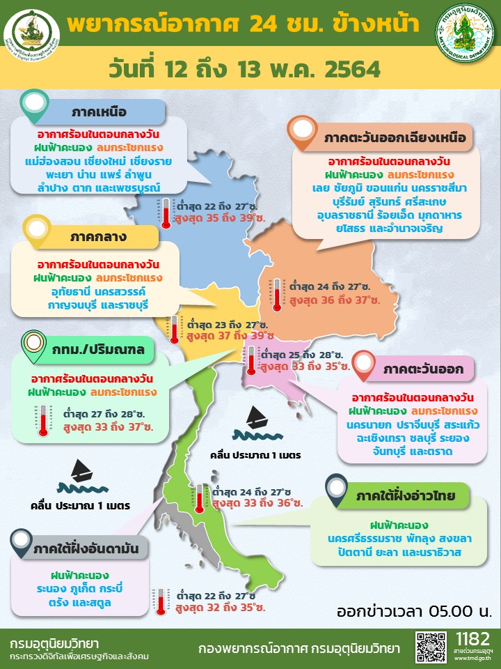 กรุงเทพฯ 12 พ.ค. – กรมอุตุฯ เผยทั่วไทยยังมีฝนฟ้าคะนองและลมกระโชกแรงบางพื้นที่ ไทยตอนบนอากาศร้อนในตอนกลางวัน