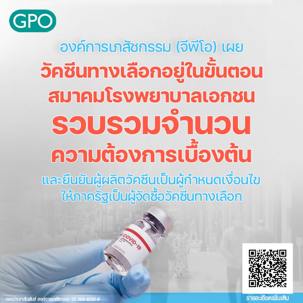 ภญ. ศิริกุล เมธีวีรังสรรค์ รองผู้อำนวยการองค์การเภสัชกรรม กล่าวว่า ตามที่มีสื่อสังคมออนไลน์นำเสนอข่าว ข้อเรียกร้องให้รัฐบาลเร่งนำเข้าวัคซีนทางเลือกเพื่อยับยั้งการแพร่ระบาดของโรคโควิด-19 ว่า วัคซีนทางเลือกเป็นวัคซีนที่นอกเหนือจากวัคซีนที่อยู่ในแผนการจัดซื้อของรัฐบาลที่ต้องการให้มีการฉีดวัคซีนเพื่อสร้างภูมิคุ้มกันหมู่ซึ่งประชาชนสามารถได้รับการฉีดโดยไม่เสียค่าใช้จ่าย ส่วนวัคซีนทางเลือกนั้น องค์การเภสัชกรรมได้ร่วมมือกับโรงพยายาลเอกชน โดยสมาคมโรงพยาบาลเอกชน เพื่อให้ประชาชนมีทางเลือกในการฉีดวัคซีนโควิด 19 ที่หลากหลายเพิ่มมากขึ้น ซึ่งวัคซีนยี่ห้อที่จะจัดหามาในช่วงแรกนี้คือโมเดอร์นา ซึ่งได้รับการขึ้นทะเบียนไปเมื่อวันที่ 13 พฤษภาคม 2564 ที่ผ่านมาซึ่งยังต้องมีรายละเอียดในการดำเนินการจัดหาอีกหลายขั้นตอน และอยู่ในระหว่างที่สมาคมโรงพยาบาลเอกชนรวบรวมจำนวนความต้องการเบื้องต้นก่อนดำเนินการในขั้นตอนต่อไป โดยการฉีดวัคซีนทางเลือกนี้ผู้รับบริการจะเป็นผู้รับผิดชอบจ่ายค่าใช้จ่ายให้แก่โรงพยาบาลเอกชนเอง