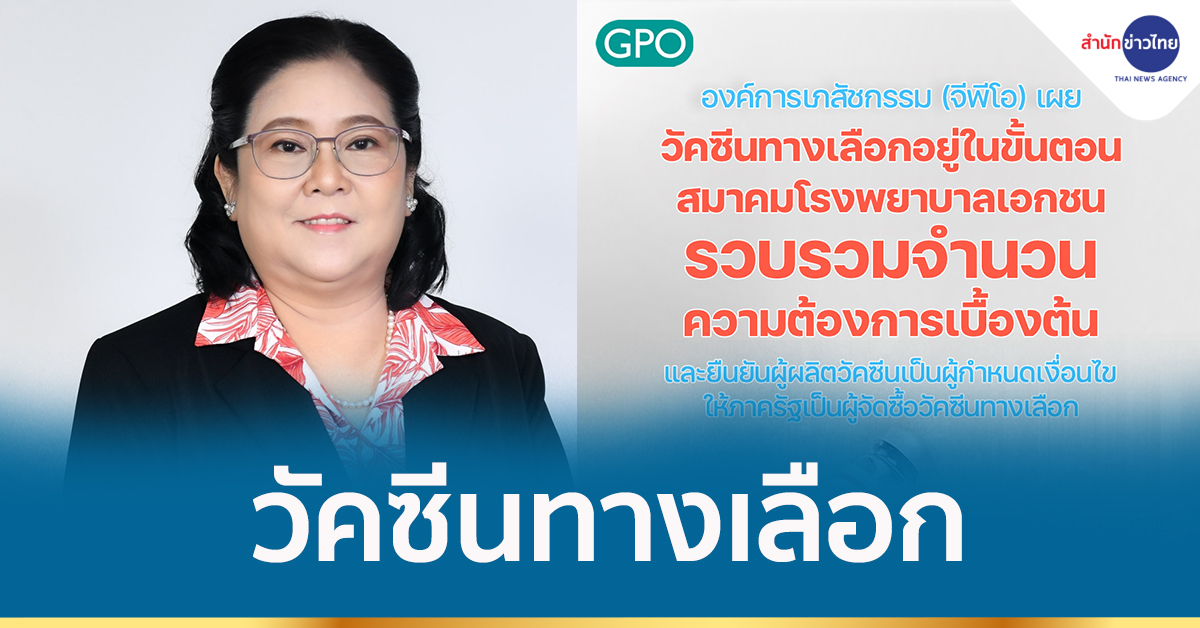 กรุงเทพฯ 22 พ.ค.-องค์การเภสัชกรรม (จีพีโอ) เผยวัคซีนทางเลือกอยู่ในขั้นตอนสมาคมโรงพยาบาลเอกชนรวบรวมจำนวนความต้องการเบื้องต้น และยืนยันผู้ผลิตวัคซีนเป็นผู้กำหนดเงื่อนไขให้ภาครัฐเป็นผู้จัดซื้อวัคซีนทางเลือก