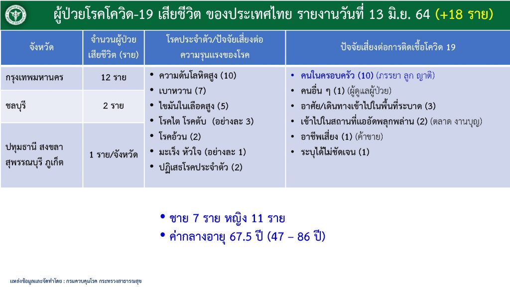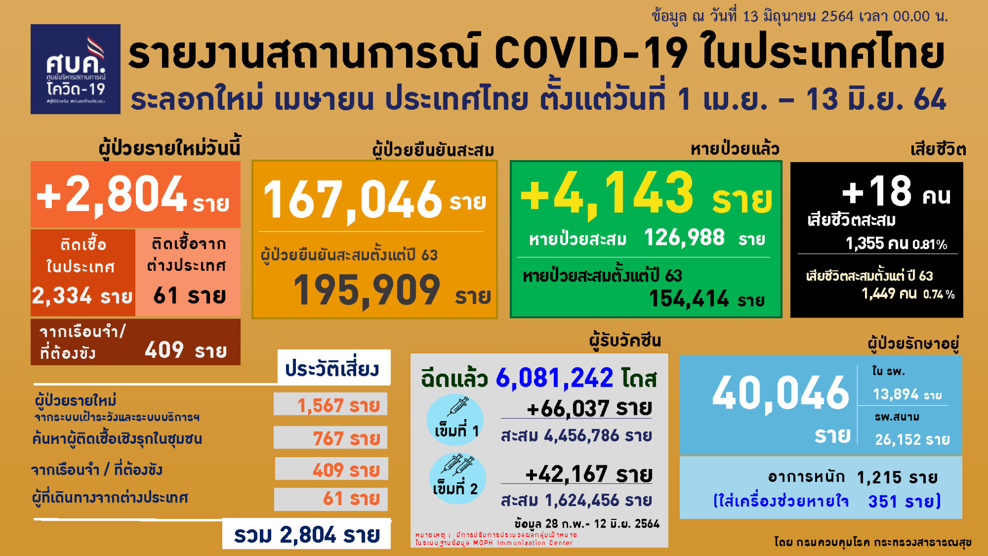 กรุงเทพฯ 13 มิ.ย. – ศบค. เผยไทยติดเชื้อโควิดรายใหม่ 2,804 ราย เสียชีวิต 18 ราย พบคลัสเตอร์ใหม่ใน กทม. อีก 4 แห่ง จตุจักร-ห้วยขวาง-คันนายาว-บางนา