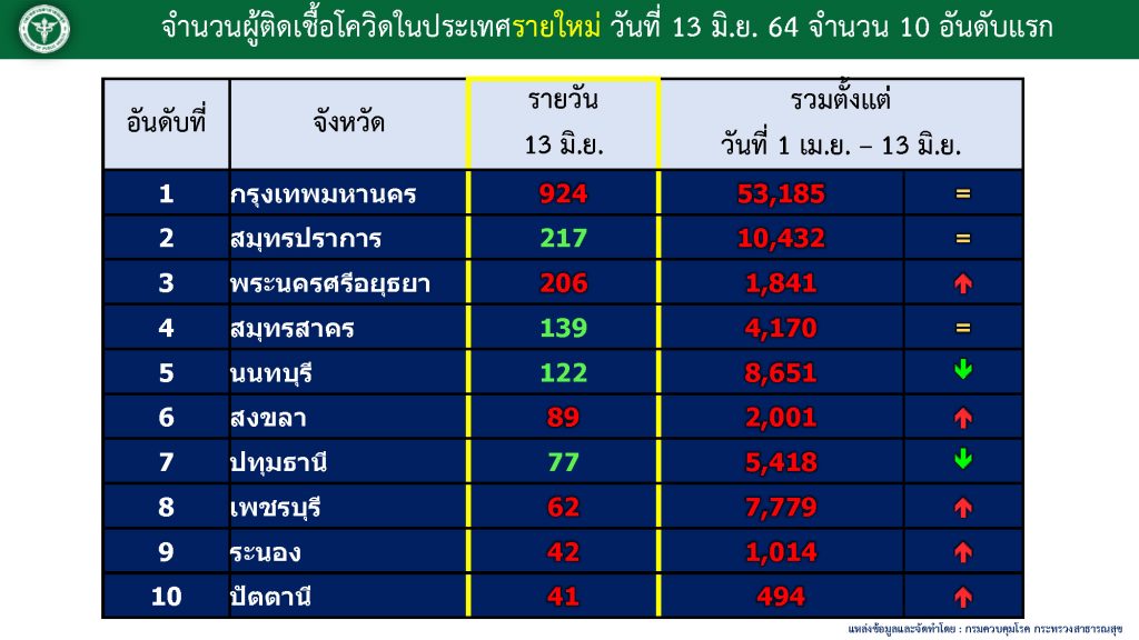 จังหวัดที่มีผู้ติดเชื้อ 10 อันดับ คือ กรุงเทพฯ 924 ราย สมุทรปราการ 217 ราย พระนครศรีอยุธยา 206 ราย สมุทรสาคร 139 ราย นนทบุรี 122 ราย สงขลา 89 ราย ปทุมธานี 77 ราย เพชรบุรี 62 ราย ระนอง 42 ราย และปัตตานี 41 ราย