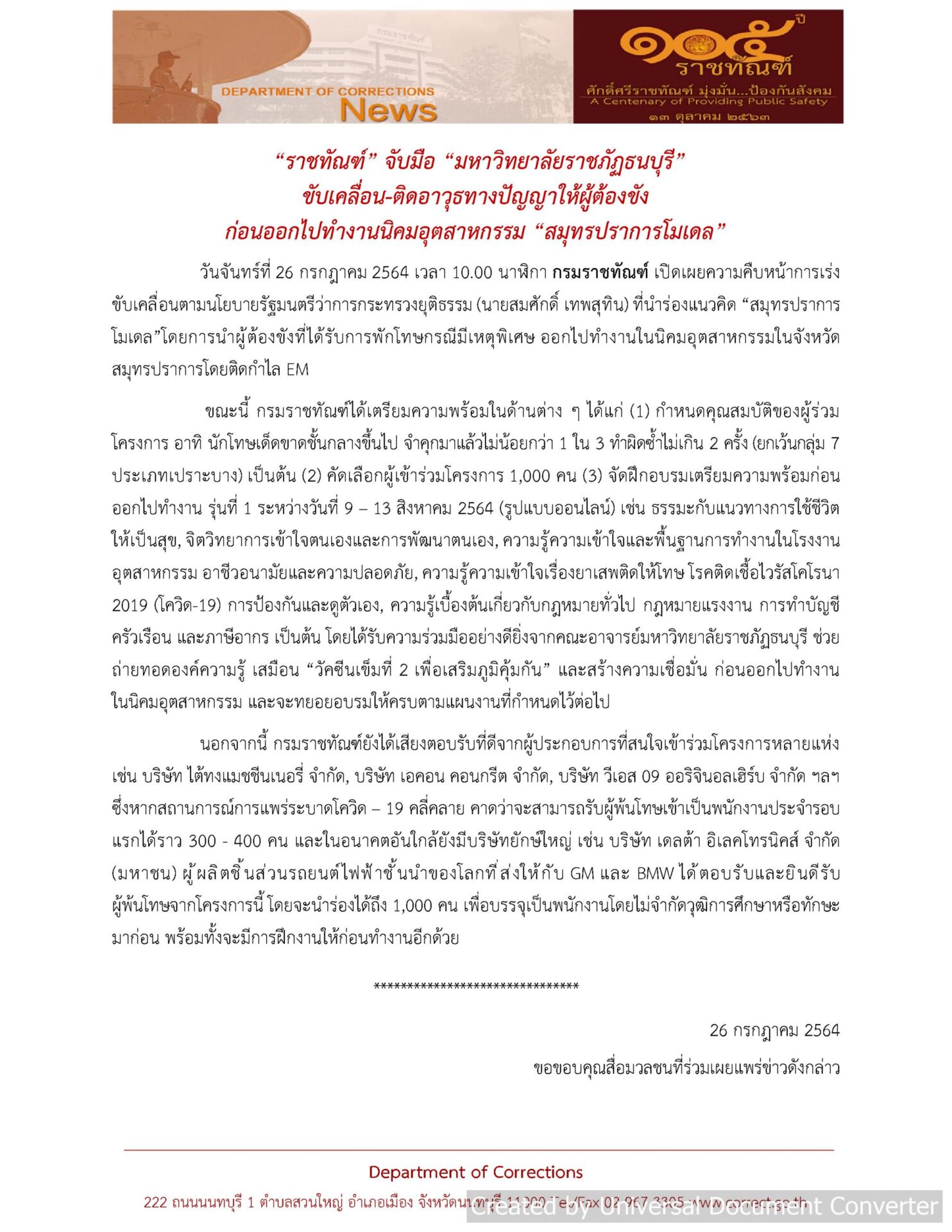 กรุงเทพฯ 26 ก.ค. – “ราชทัณฑ์” จับมือ “มหาวิทยาลัยราชภัฏธนบุรี” ขับเคลื่อน-ติดอาวุธทางปัญญาให้ผู้ต้องขัง ก่อนออกไปทำงานนิคมอุตสาหกรรม “สมุทรปราการโมเดล”