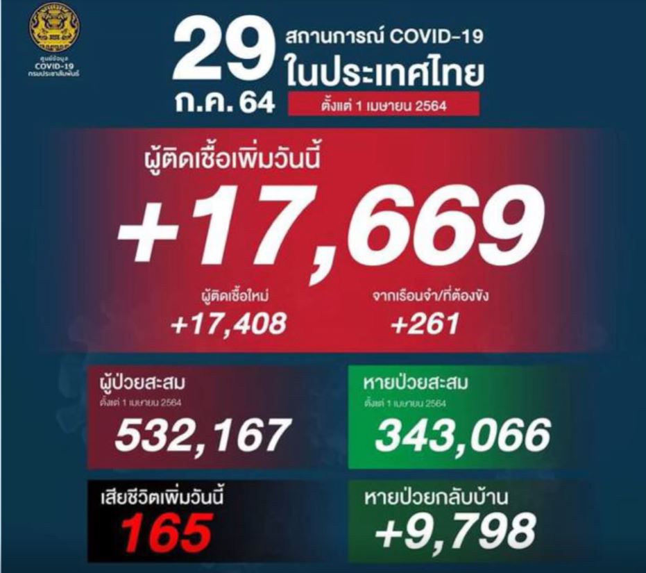 ศูนย์ข้อมูล COVID-19 รายงานพบผู้ติดเชื้อใหม่ 17,408 คน ติดเชื้อในเรือนจำ/ที่ต้องขัง 261 คน และเสียชีวิต 165 คน ทำให้ตอนนี้ไทยพบผู้ติดเชื้อระลอกเมษายน แล้ว 532,167 คน เสียชีวิต 4,468 คน และนับเป็นวันที่ 13 แล้วที่ไทยมีตัวเลขติดเชื้อทะลุหลักหมื่น