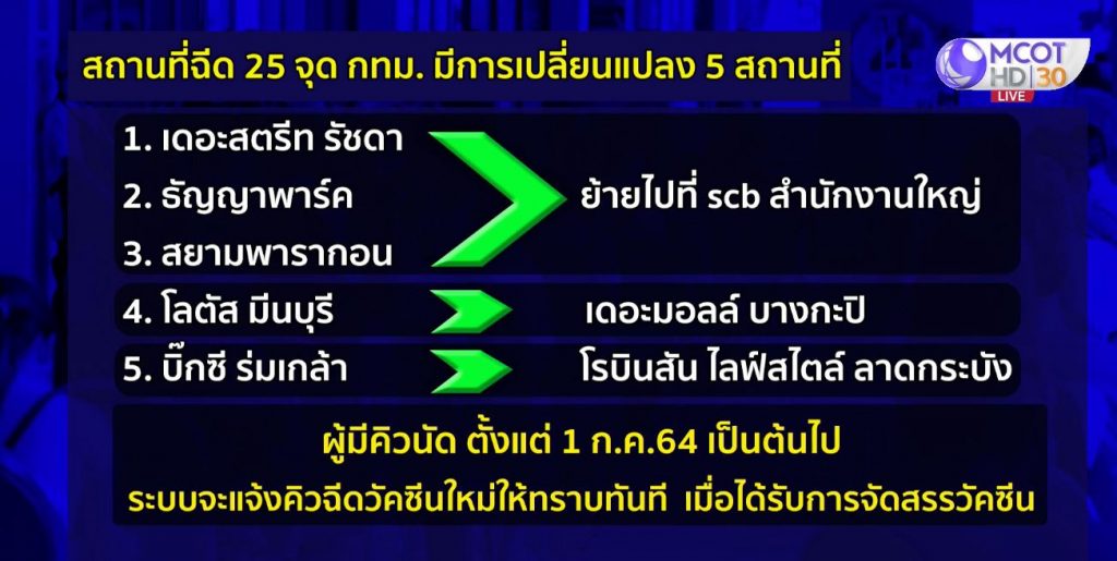 นอกจากนี้ สถานที่ฉีด 25 จุด ที่เปิดให้ฉีดในพื้นที่กรุเงพทฯ มีอยู่ 5 สถานที่ ที่มีการย้ายจุดฉีด คือ จุดฉีด เดอะสตรีท รัชดา, ธัญญาพาร์ค, สยามพารากอน 3 ที่นี้ย้ายไปฉีดที่ scb สำนักงานใหญ่ ส่วนจุดฉีดโลตัส มีนบุรี ย้ายไปฉีดที่ จุดฉีดเดอะมอลล์ บางกะปิ และจุดฉีดบิ๊กซี ร่มเกล้า ย้ายไปฉีด โรบินสัน ไลฟ์สไตล์ ลาดกระบัง . – สำนักข่าวไทย