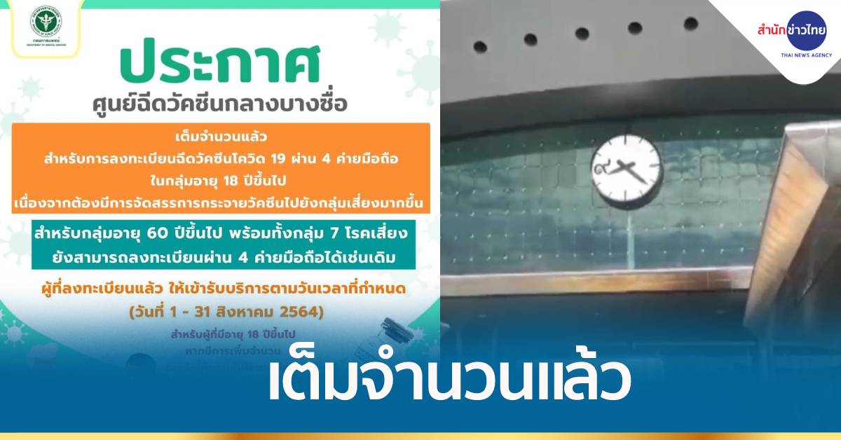 กทม. 29 ก.ค. – กรมการแพทย์ประกาศ ศูนย์ฉีดวัคซีนกลางบางซื่อเต็มจำนวนแล้ว สำหรับการลงทะเบียนฉีดวัคซีนโควิด-19 ผ่าน 4 ค่ายมือถือในกลุ่มอายุ 18 ปีขึ้นไป เนื่องจากต้องมีการจัดสรรการกระจายวัคซีนไปยังกลุ่มเสี่ยงมากขึ้น ส่วนกลุ่มอายุ 60 ปีขึ้นไป พร้อมทั้งกลุ่ม 7 โรคเสี่ยง ยังสามารถลงทะเบียนผ่าน 4 ค่ายมือถือได้เช่นเดิม ผู้ที่ลงทะเบียนแล้วให้เข้ารับบริการตามวันเวลาที่กำหนด (วันที่ 1-31 สิงหาคม 2564) แต่สำหรับผู้ที่มีอายุ 18 ปีขึ้นไป หากมีการเพิ่มจำนวน จะแจ้งให้ทราบในโอกาสต่อไป