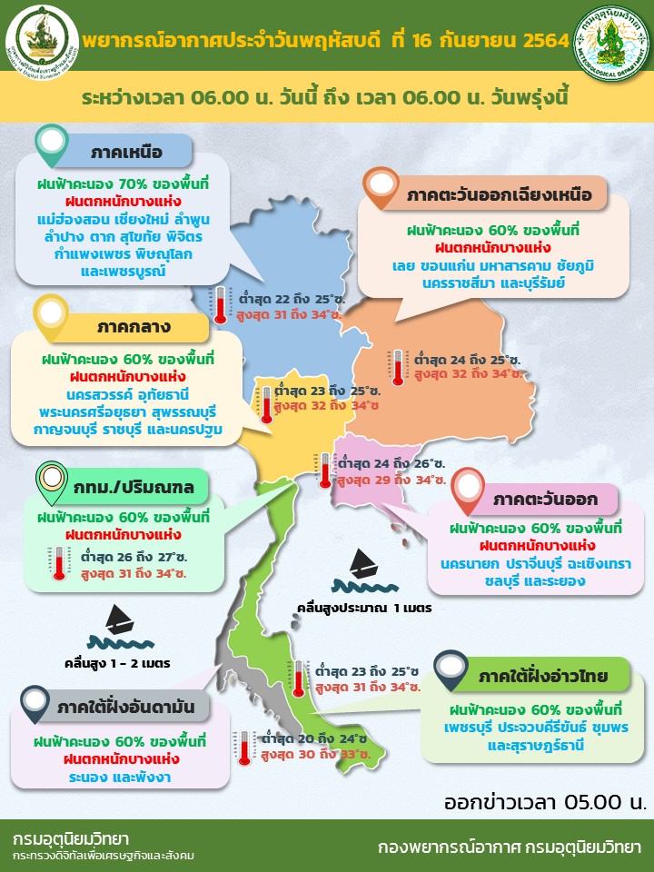 กรมอุตุนิยมวิทยา พยากรณ์อากาศ 24 ชั่วโมงข้างหน้า ร่องมรสุมพาดผ่านภาคเหนือตอนล่าง ภาคกลาง และภาคตะวันออกเฉียงเหนือตอนล่าง ประกอบกับมรสุมตะวันตกเฉียงใต้ที่พัดปกคลุมทะเลอันดามัน ภาคใต้ และอ่าวไทยมีกำลังปานกลาง ลักษณะเช่นนี้ทำให้ประเทศไทยมีฝนตกต่อเนื่อง โดยมีฝนตกหนักบางแห่งบริเวณภาคเหนือ ภาคตะวันออกเฉียงเหนือ ภาคกลาง ภาคตะวันออก และภาคใต้ฝั่งตะวันตก ขอให้ประชาชนที่อาศัยอยู่ในพื้นที่เสี่ยงภัยบริเวณดังกล่าว ระวังอันตรายจากฝนตกหนักและฝนที่ตกสะสมซึ่งอาจทำให้เกิดน้ำท่วมฉับพลัน และน้ำป่าไหลหลากไว้ด้วย