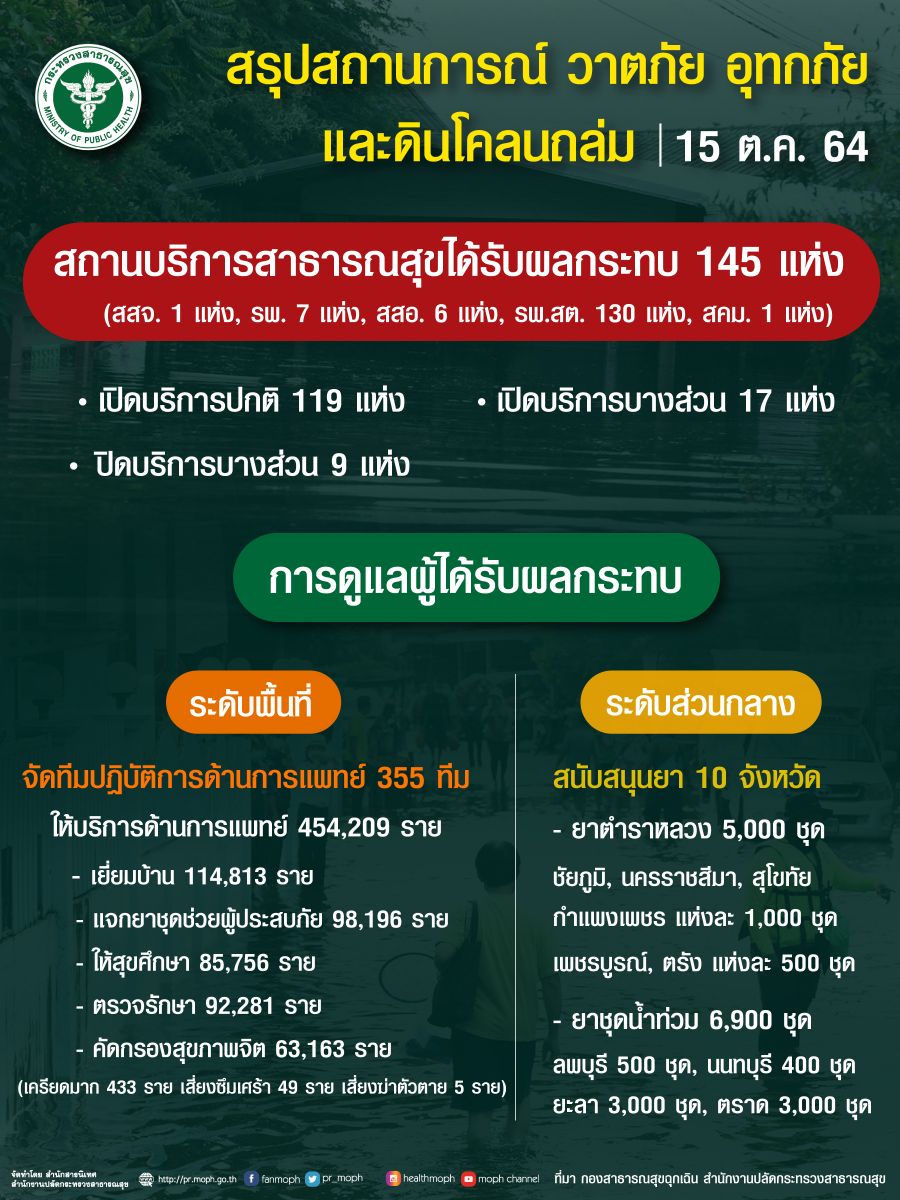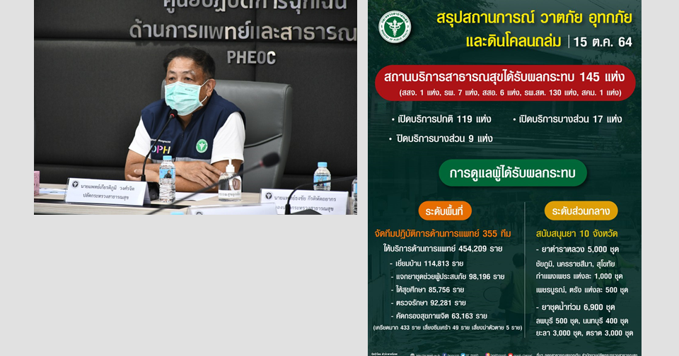 นพ.เกียรติภูมิ กล่าวต่อว่า สำหรับสถานการณ์น้ำท่วมจากพายุ “เตี้ยนหมู่” ยังมีพื้นที่ได้รับผลกระทบใน 10 จังหวัด 46 อำเภอ รวม 90,348 ครัวเรือน ส่วนน้ำท่วมจากพายุ “ไลออนร็อก”มีพื้นที่ได้รับผลกระทบ2จังหวัด 8 อำเภอ รวม 5,427ครัวเรือน ภาพรวม มีผู้ได้รับบาดเจ็บ 132 ราย เสียชีวิต 62 ราย สถานบริการสาธารณสุขได้รับผลกระทบ 145แห่ง เปิดให้บริการตามปกติ 119 แห่ง เปิดให้บริการบางส่วน 17 แห่งและปิดให้ บริการ 9 แห่ง ทีมปฏิบัติการด้านการแพทย์ 355 ทีม ให้บริการประชาชนและผู้ประสบภัยรวม 454,209 ราย ประกอบด้วยเยี่ยมบ้าน 114,813 ราย แจกยาชุดช่วยเหลือผู้ประสบภัย 98,196 ราย ให้สุขศึกษา 85,796 ราย และให้บริการตรวจรักษา 92,281 ราย ส่วนการประเมินสุขภาพจิต 63,163 ราย ส่วนใหญ่อยู่ในภาวะปกติ พบภาวะเครียดระดับมากขึ้นไป 433 ราย เสี่ยงภาวะซึมเศร้า 49 ราย และเสี่ยงต่อการฆ่าตัวตาย 5 ราย .-สำนักข่าวไทย