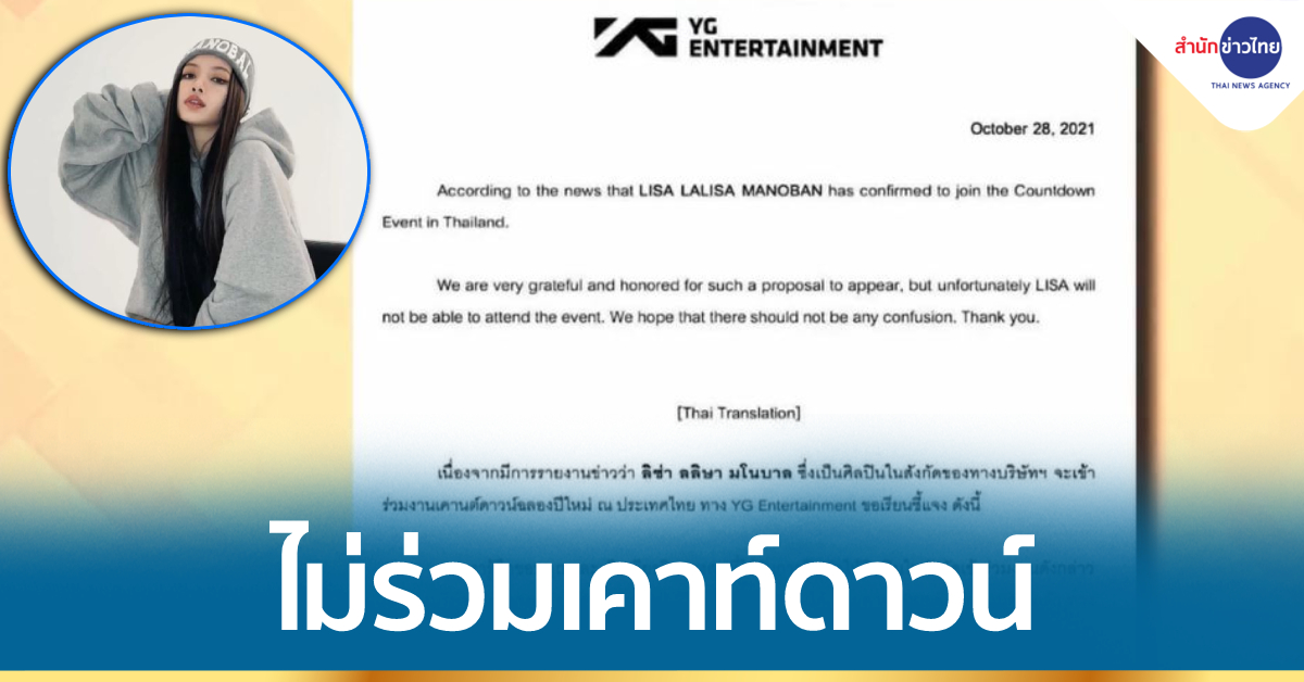 กรุงเทพฯ 28 ต.ค. – วายจี เอ็นเตอร์เทนเมนต์ ต้นสังกัดของ “ลิซ่า” ออกแถลงลิซ่าไม่สามารถเข้าร่วมงานเคาท์ดาวน์ปีใหม่ จ.ภูเก็ต เนื่องจากตารางงานถูกกำหนดไว้แล้ว