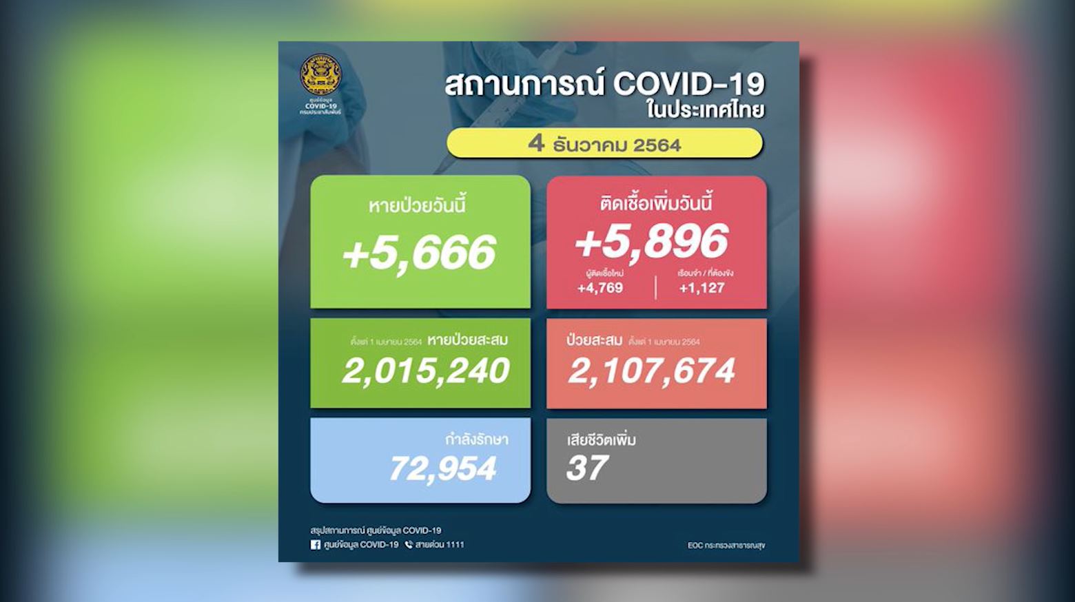 กรุงเทพฯ 4 ธ.ค.-สถานการณ์โควิด-19 ในไทย วันนี้ พบผู้ติดเชื้อเพิ่ม 5,896 คน เสียชีวิต 37 คน ผู้ป่วยอาการหนัก 1,299 คน