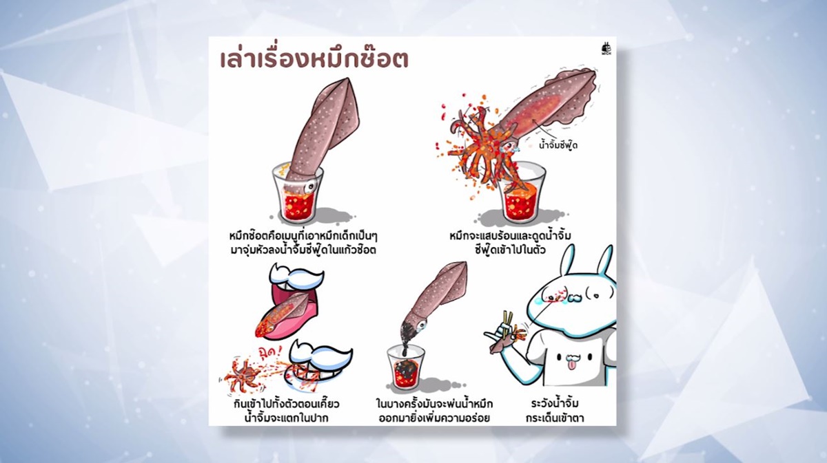 กลายเป็นกระแสไวรัลในแอปฯ TikTok สำหรับเมนู “หมึกช็อต” ที่มีการนำหมึกตัวเป็นๆ มาจุ่มน้ำจิ้มซีฟู้ดในแก้วชอต เอาใจเหล่าสาวกซีฟู้ดและสายซาชิมิ โดยวิธีกิน ทางเพจเฟซบุ๊ก ซวยชิบหายเสือกเกิดมาอร่อย ระบุว่า เมนูดังกล่าวจะมีการนำหมึกเป็นๆ ปักลงไปในน้ำจิ้มซีฟู้ด แล้วหมึกจะดูดน้ำจิ้มเข้าไปในตัวตามสัญชาตญาณ กลายเป็นว่าต้องสูดน้ำจิ้มซีฟู้ดที่เผ็ดร้อนเข้าไปในตัว แทนที่จะเป็นน้ำทะเล