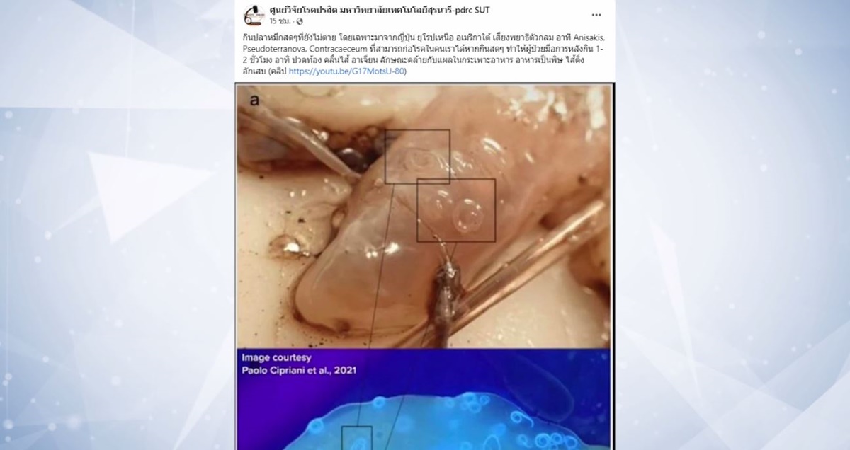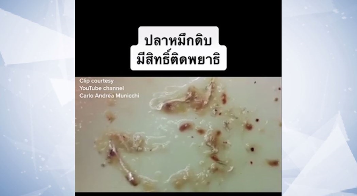 ด้านนักวิจัยศูนย์วิจัยโรคปรสิต สำนักวิชาแพทยศาสตร์ มหาวิทยาลัยเทคโนโลยีสุรนารี ออกมาเตือนถึงการกินหมึกสดๆ ที่ยังไม่ตาย โดยเฉพาะมาจากญี่ปุ่น ยุโรปเหนือ อเมริกาใต้ เสี่ยงพยาธิตัวกลม สามารถก่อโรคในคนเราได้ หากกินสดๆ ทำให้ผู้ป่วยมีอาการหลังกิน 1-2 ชั่วโมง อาทิ ปวดท้อง คลื่นไส้ อาเจียน ลักษณะคล้ายกับแผลในกระเพาะอาหาร อาหารเป็นพิษ ไส้ติ่งอักเสบ