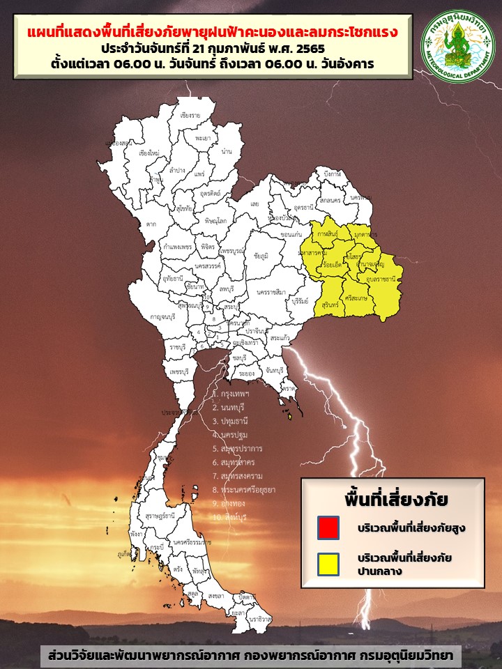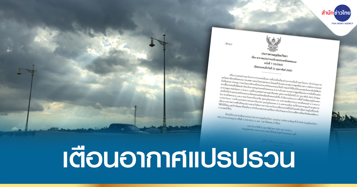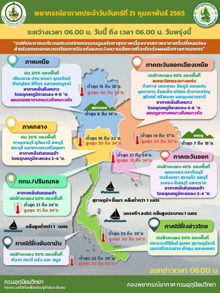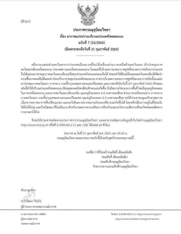 กรมอุตุนิยมวิทยา ออกประกาศ เรื่อง อากาศแปรปรวนบริเวณประเทศไทยตอนบน (มีผลกระทบถึงวันที่ 21 กุมภาพันธ์ 2565) ฉบับที่ 7 ลงวันที่ 21 กุมภาพันธ์ 2565 ระบุว่า คลื่นกระแสลมฝ่ายตะวันตกจากประเทศเมียนมาได้เคลื่อนผ่านภาคเหนือด้านตะวันออก เข้าปกคลุมภาคตะวันออกเฉียงเหนือตอนบน ประเทศลาว และเวียดนามตอนบน ในขณะที่บริเวณความกดอากาศสูงหรือมวลอากาศเย็นจากประเทศจีนได้แผ่ลงมาปกคลุมภาคตะวันออกเฉียงเหนือของประเทศไทยและทะเลจีนใต้ ส่งผลทำให้มีลมใต้และลมตะวันออกเฉียงใต้พัดนำความชื้นจากทะเลจีนใต้และอ่าวไทยเข้ามาปกคลุมประเทศไทยตอนบน คาดว่าบริเวณความกดอากาศสูงหรือมวลอากาศเย็นนี้จะแผ่ลงมาปกคลุมภาคตะวันออก ภาคกลาง รวมทั้งกรุงเทพมหานครและปริมณฑล และภาคเหนือ ในวันนี้ (21 กุมภาพันธ์ 2565) ลักษณะเช่นนี้ทำให้บริเวณประเทศไทยตอนบน มีฝนลดลง แต่ยังคงมีฝนฟ้าคะนองเกิดขึ้น กับมีลมกระโชกแรงบางพื้นที่ โดยมีอุณหภูมิลดลง ในภาคเหนือตอนบน และภาคตะวันออกเฉียงเหนือ อุณหภูมิจะลดลง 4-6 องศาเซลเซียส ส่วนภาคเหนือตอนล่าง ภาคกลาง ภาคตะวันออก รวมทั้งกรุงเทพมหานคร และปริมณฑล อุณหภูมิจะลดลง 2-4 องศาเซลเซียส ขอให้ประชาชนดูแลรักษาสุขภาพ เนื่องจากสภาพอากาศที่เปลี่ยนแปลง และระวังอันตรายจากลมกระโชกแรงที่อาจจะเกิดขึ้นได้ โดยหลีกเลี่ยงการอยู่ในที่โล่งแจ้ง ใต้ต้นไม้ใหญ่ และป้ายโฆษณาที่ไม่แข็งแรง สำหรับเกษตรกรควรเตรียมการป้องกันและระวังความเสียหายที่จะเกิดต่อผลผลิตทางการเกษตรไว้ด้วย