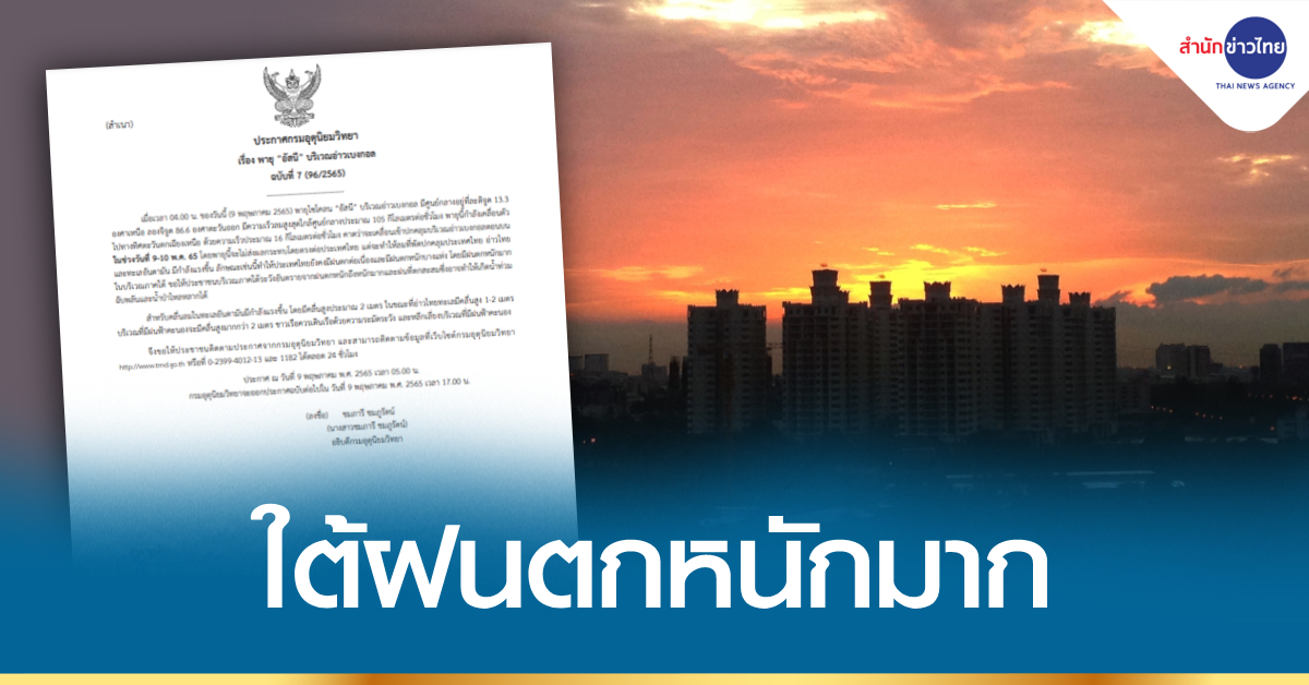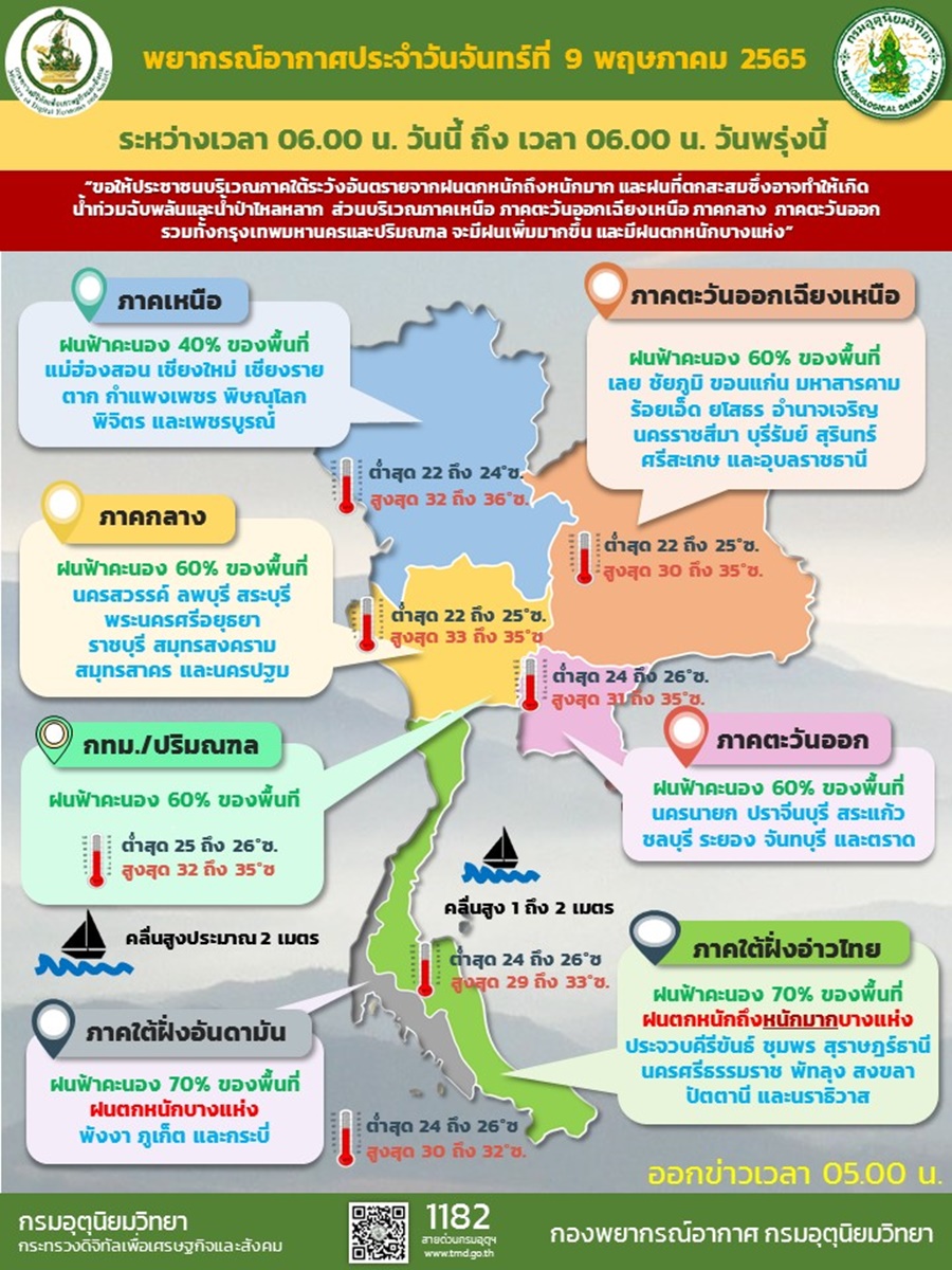 กรมอุตุฯ 9 พ.ค. – กรมอุตุฯ ออกประกาศฉบับที่ 7 พายุ “อัสนี” บริเวณอ่าวเบงกอล จ่อเคลื่อนเข้าปกคลุมอ่าวเบงกอลตอนบน ช่วงวันที่ 9-10 พ.ค.นี้ ส่งผลให้ไทยยังคงมีฝนตกต่อเนื่องและตกหนักบางแห่ง โดยมีฝนตกหนักมากในภาคใต้ ระวังน้ำท่วมฉับพลันและน้ำป่าไหลหลาก