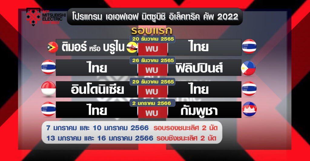 รอบรองชนะเลิศ 2 นัด แข่งขันวันที่ 7 มกราคม และ 10 มกราคม 2566 ขณะที่ รอบชิงชนะเลิศ แข่ง 2 นัด 13 มกราคม และ 16 มกราคม 2566 .-สำนักข่าวไทย