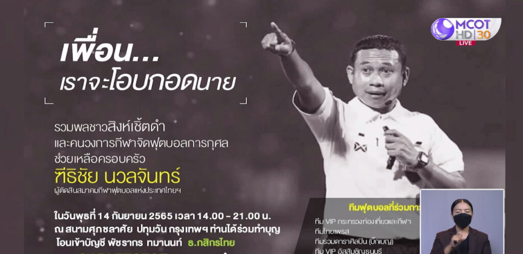 ด้านกลุ่มเพื่อนพ้องน้องพี่ผู้ตัดสิน นำโดย “เปาหนอม“ ส.อ.ถนอม บริคุต “เปาเก๋” ธีรจิตร สิทธิสุข เตรียมจัดงานรวมพลชาวสิงห์เชิ้ตดำและคนวงการกีฬาจัดฟุตบอลการกุศลวันพุธที่ 14 ก.ย.นี้เวลา 15.00 น. ที่สนามศุภชลาศัย ช่วยเหลือครอบครัว “เปาตี๋” ฑีธิชัย นวลจันทร์ ที่เสียชีวิตด้วยอุบัติเหตุรถยนต์ หลังทำหน้าที่เกมฟุตบอล ไทยลีก เมื่อคู่ หนองบัว พิชญ แพ้ ราชบุรี 0-2 คืนวันศุกร์ที่ 2 ก.ย.ที่ จ.หนองบัวลำภู