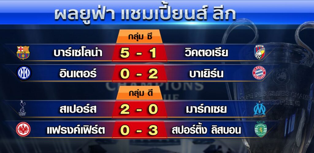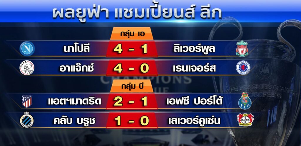 ผลยูฟ่า แชมเปียนส์ ลีก นัดแรก กลุ่มเอ นาโปลี จากอิตาลี เปิดบ้านพบ “หงส์แดง” ลิเวอร์พูล จากอังกฤษ เริ่มเกมเพียง 5 นาที ปีเตอร์ ซีลินสกี้ ซัดจุดโทษเข้าไปในเจ้าถิ่นขึ้นนำ 1-0 จากนั้นนาโปลียังทำเกมได้ดีกว่า มายิงเพิ่มอีก 2 ประตูจาก อังเดร อองกีส์ซา นาทีที่ 31 และ โจวานนี ซิเมโอเน นาทีที่ 44 ช่วยให้เจ้าถิ่นนำห่าง 3-0 ครึ่งหลังเริ่มเกมเพียง 2 นาที ซีลินสกี้ มาทำประตูที่ 2 ในนัดนี้ช่วยให้ นาโปลี นำห่าง 4-0 ก่อนที่ หลุยส์ ดิอาซ จะยิงประตูตีไข่แตกนาทีที่ 49 จบเกม นาโปลี เอาชนะ 4-1 ประเดิม 3 แต้มแรกได้สำเร็จ