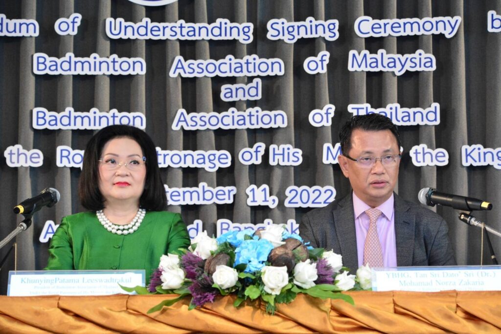 กรุงเทพฯ 11 ก.ย.65-สมาคมกีฬาแบดมินตันแห่งประเทศไทยฯ จัดให้มีพิธีลงนามบันทึกความร่วมมือ (MOU) กับ สมาคมกีฬาแบดมินตันแห่งมาเลเซีย เพื่อแลกเปลี่ยนผู้ฝึกสอน กรรมการผู้ตัดสิน และผู้เชี่ยวชาญ ศักยภาพของนักกีฬา และองค์ความรู้ด้านวิทยาศาสตร์การกีฬา โดยบันทึกความร่วมมือครั้งนี้ ลงนามโดย คุณหญิงปัทมา ลีสวัสดิ์ตระกูล นายกสมาคมกีฬาแบดมินตันแห่งประเทศไทยฯ กับ Tan Sri Dr. Norza Zakaria ประธานสมาคมกีฬาแบดมินตันแห่งมาเลเซีย ที่ห้องปัทมชาติ ชั้น 23 โรงแรมอโนมาแกรนด์ กรุงเทพฯ