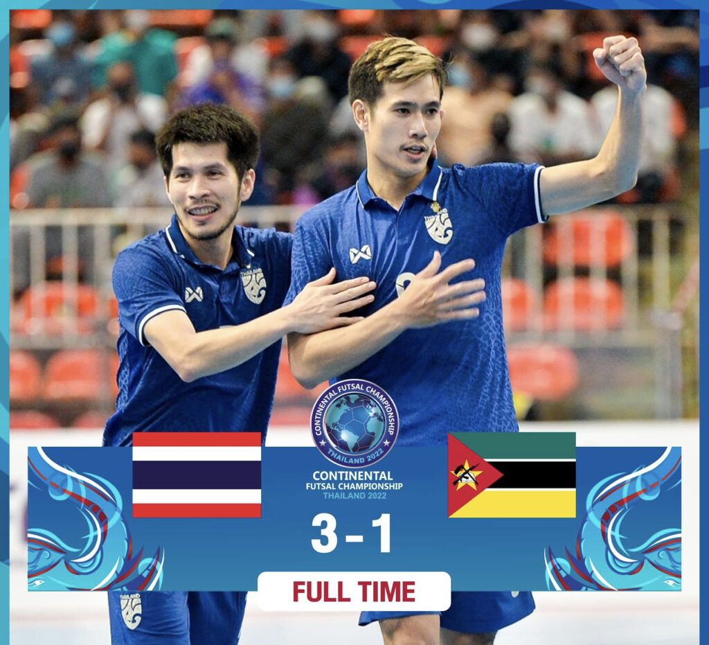กรุงเทพฯ 13 ก.ย. 65-ฟุตซอลทีมชาติไทย ลงเล่นนัดส่งท้ายรอบแบ่งกลุ่มศึก “คอนติเนนทัล ฟุตซอล แชมเปี้ยนชิพ ไทยแลนด์ 2022” ที่อินดอร์ สเตเดียม หัวหมาก เมื่อวันที่ 13 กันยายน 2565 เอาชนะ โมซัมบิก 3-1 จากการยิงของ ณรงค์ศักดิ์ วิงวอน, อิทธิชา ประภาพันธ์ และ เจษฎา ชูเดช