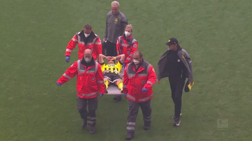 มาร์โก รอยส์ ดาวเตะวัย 33 ปี ได้รับบาดเจ็บจากจังหวะปะทะกับ ฟลอเรียน ฟลิค มิดฟิลด์ของชาลเก จนถูกหามขึ้นเปลออกจากสนามไป ตั้งแต่นาทีที่ 32. – สำนักข่าวไทย