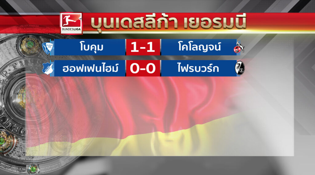 ส่วนฟุตบอลบุนเดสลีกา เยอรมนี ยูนิโอน เบอร์ลิน เปิดรังรับการมาเยือนของ โวล์ฟสบวร์ก ครึ่งหลัง เจ้าถิ่นเริ่มครองเกมได้เหนือกว่า ก่อนจะยิงได้ 2 ประตูรวดจาก จอร์แดน ซีบัตเชอู นาที 54 และ เชรัลโด เบคเกอร์ นาทีที่ 77 จบเกม ยูนิโอน เบอร์ลิน เปิดบ้านเชือด 2-0 เก็บเพิ่มเป็น 17 แต้มจาก 7 นัด แซงกลับขึ้นไปรั้งจ่าฝูง โดยนำ โบรุสเซีย ดอร์ตมุนด์ ที่อยู่อันดับ 2 อยู่ 2 คะแนน ส่วน โวล์ฟสบสร์ก เตะ 7 นัดมี 5 คะแนน รั้งที่ 17 หรือรองบ๊วยของตาราง ผลอีก 2 คู่ โบคุม เสมอ โคโลญจน์ 1-1 และ ฮอฟเฟนไฮม์ เสมอ ไฟรบวร์ก 0-0