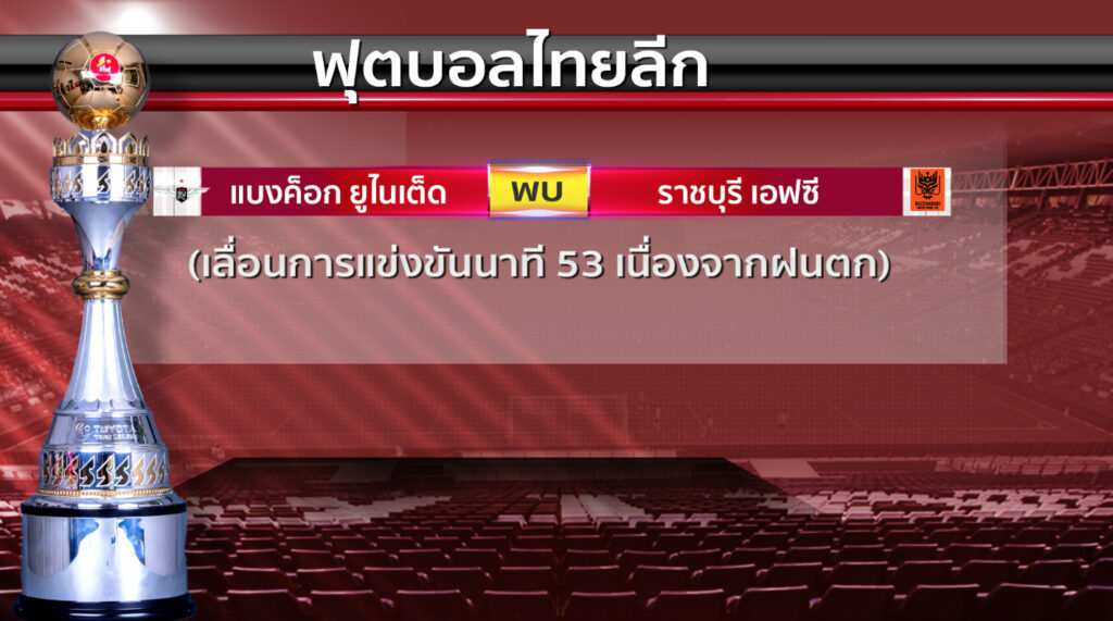 ทรู แบงค็อก ยูไนเต็ด กับ ราชบุรี เอฟซี แข่งขันถึงนาที 53 ยังเสมอกัน 0-0 เลื่อนการแข่งขัน เนื่องจากมีฝนตกลงมาอย่างหนัก โดยจะยึดสกอร์ ผู้เล่น และเวลาแข่งขันที่เหลือไปแข่งขันต่อให้จบ ส่วนวันแข่งรอพิจารณาอีกครั้ง