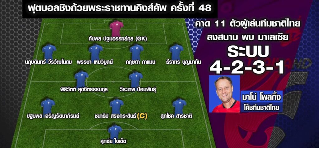 สำหรับ 11 ผู้เล่นที่คาดว่า มาโน่ โพลกิ้ง จะส่งลงสนาม ในระบบ 4-5-1 ประกอบด้วย กัมพล ปฐมอรรฆย์กุล เป็นผู้รักษาประตู แบ็กขวา นฤบดินทร์ วีรวัฒโนดม คู่เซ็นเตอร์ฮาล์ฟ พรรษา เหมวิบูลย์ จับคู่กับ กฤษดา กาแมน