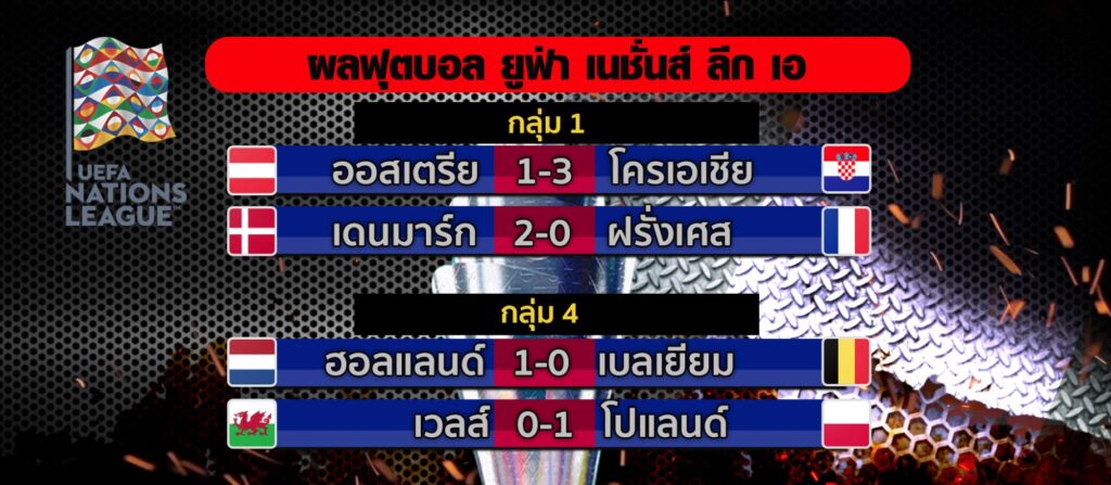 ฟุตบอลยูฟ่า เนชันส์ ลีก นัดส่งท้ายรอบแบ่งกลุ่ม ลีกเอ กลุ่ม 1 เดนมาร์ก เปิดบ้านเอาชนะ ฝรั่งเศส แชมป์เก่า 2-0 ทีมโคนม ได้ 2 ประตูจาก แคสเปอร์ โดลเบิร์ก ในนาทีที่ 34 และอันเดรียส โอลเซน ในนาทีที่ 39 ทำให้ทีมโคนม มี 12 คะแนน จาก 6 นัดคว้าอันดับ 2 ไปครอง ส่วน “ตราไก่” มี 5 คะแนนคว้าอันดับ 3 ขณะที่แชมป์กลุ่มนี้เป็นโครเอเชีย บุกไปชนะ ออสเตรีย 3-1 มี 13 คะแนน จาก 6 นัด ผ่านเข้าไปเล่นในรอบไฟนอลส์ได้สำเร็จ ขณะที่ ออสเตรีย มี 4 แต้มรั้งบ๊วย และต้องตกชั้น