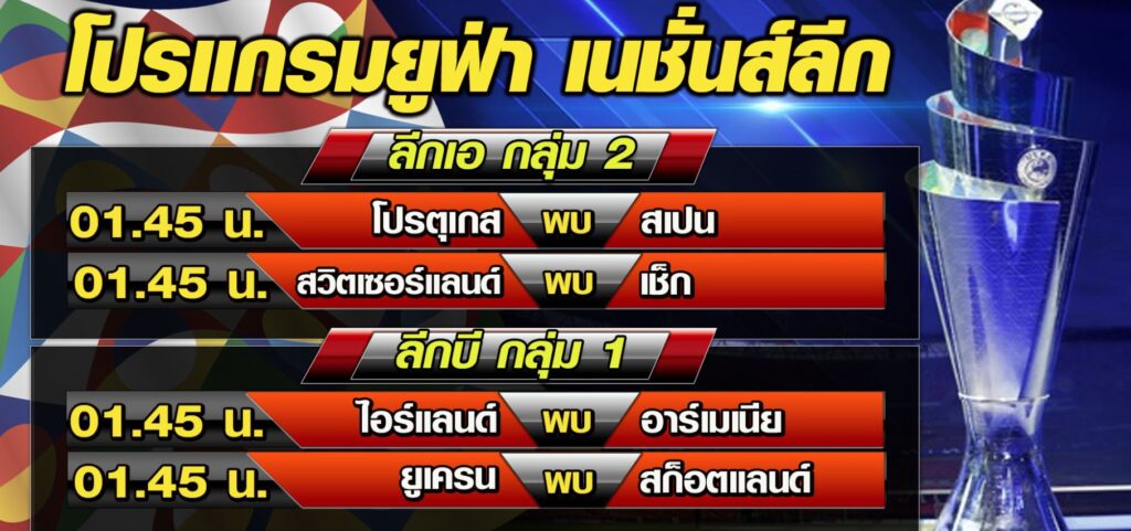 ฟุตบอลยูฟ่า เนชั่นส์ ลีก เอ กลุ่ม 2 คืนนี้ คู่บิ๊กแมตช์ เวลา 01.45 น. โปรตุเกส จ่าฝูงของกลุ่ม เปิดบ้านพบ สเปน โดยกระทิงดุต้องชนะเท่านั้น หากหวังไปเล่นรอบไฟนอลส์