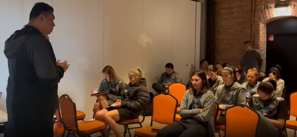 ทีมวอลเลย์บอลหญิงทีมชาติไทย ลงฝึกซ้อมที่สนามแข่งขัน แอร์โก อารีนา เป็นสนามใหญ่ จุคนดูได้ประมาณ 11,000 ที่นั่ง เมื่อเวลา 18.30 – 20.30 น. (หรือ 23.30 – 01.30 น.เวลาไทย) มีเวลาฝึกซ้อม 2 ชั่วโมง เพื่อปรับตัวเรื่องของแสงและสภาพสนาม มี “โค้ชอ๊อต” เกียรติพงษ์ รัชตเกรียงไกร อดีตหัวหน้าผู้ฝึกซ้อมทีมชาติไทย ปัจจุบันเป็นคณะกรรมการบริหารสหพันธ์วอลเลย์บอลนานาชาติ และเลขาธิการสหพันธ์วอลเลย์บอลเอเซีย เดินทางมาช่วยเสริมความแข็งแกร่งให้กับทีมไทย โดยเฉพาะเรื่องของทัศนคติและจิตใจ ส่วนเรื่องของแทคติก และแผนการเล่น “โค้ชด่วน” ดนัย ศรีวัชรเมธากุล ได้เน้นความสัมพันธ์ระหว่างตัวเซตและตัวตี