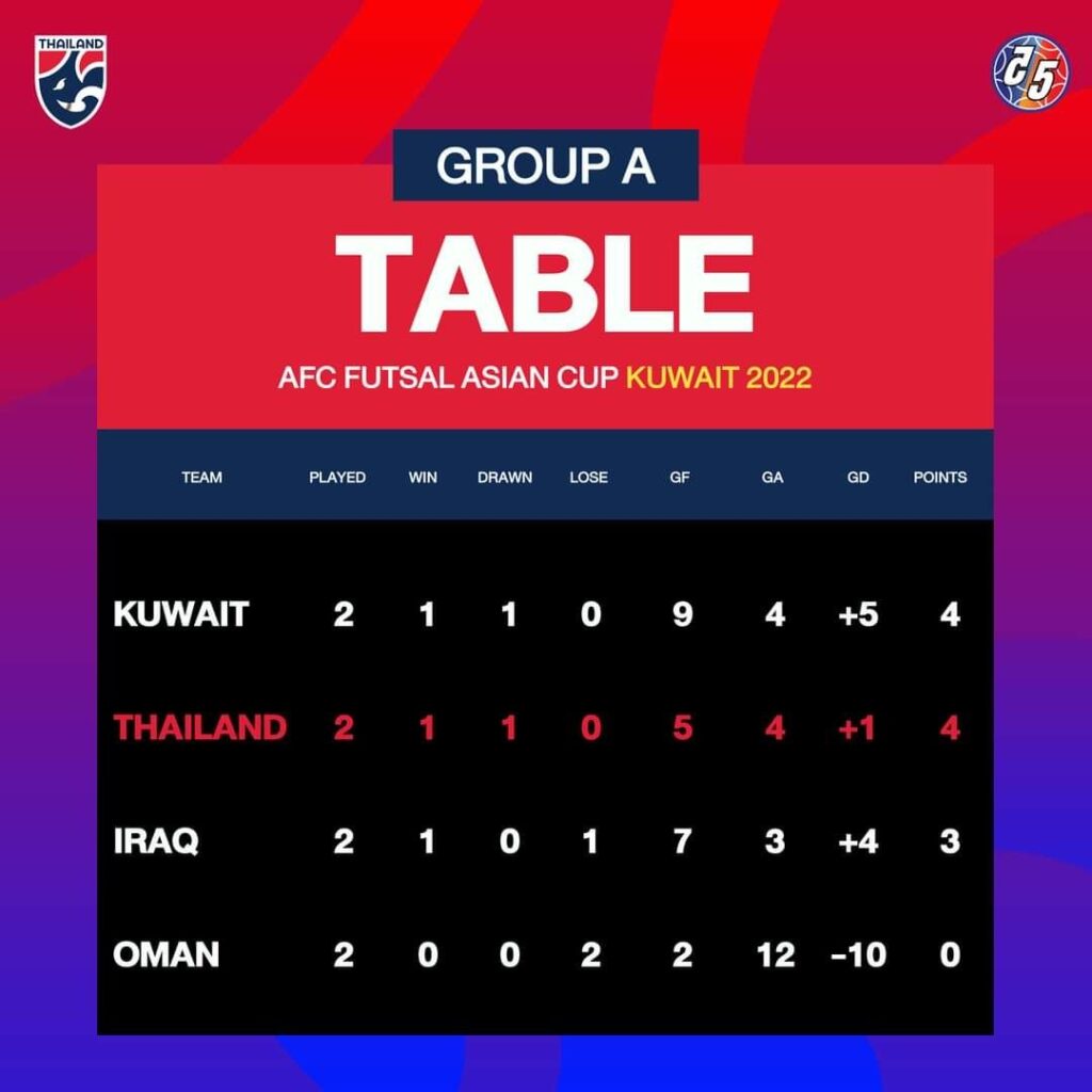 คูเวต 30 ก.ย.65-ความเคลื่อนไหวทีมฟุตซอลทีมชาติชุดลุยศึก ชิงแชมป์เอเชีย2022 ก่อนลงทำศึกรอบแบ่งกลุ่ม กลุ่มเอนัดสุดท้ายพบ ทีมชาติโอมาน วันที่ 1 ต.ค.65 นี้ เวลา 21.00น.ตามเวลาประเทศไทย โดยสถานการณ์ทีมไทยอยู่ในอันดับ 2 กลุ่มเอ จากผลงาน 2 นัดแรก ชนะ อิรัก 3-2 และ เสมอ คูเวต 2-2 มี 4 แต้ม เท่ากับ คูเวต แต่ประตูได้เสียเป็นรอง โดยเงื่อนไขนัดสุดท้ายชนะหรือเสมอ ทีมไทย จะผ่านเข้ารอบ 8 สุดท้ายทันที