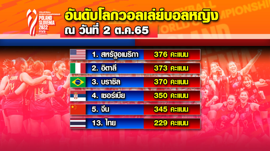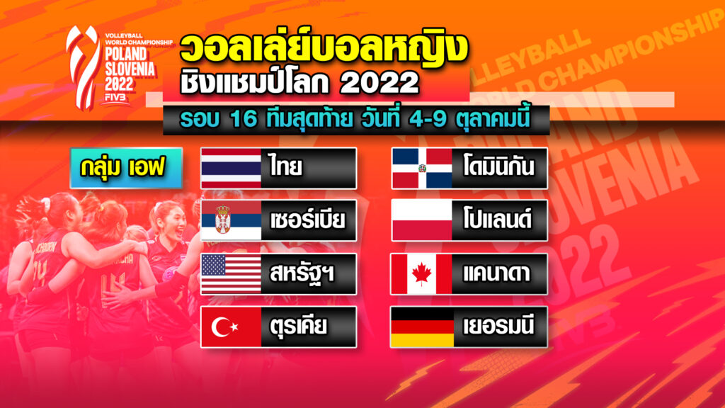 โปแลนด์ 2 ต.ค.-ทีมลูกยางสาวไทย ขยับขึ้นไปรั้งอันดับ 13 ของโลก หลังเฉือนชนะ โดมินิกัน สุดมัน 3-2 เซต พร้อมผ่านเข้ารอบ 16 ทีมสุดท้าย วอลเลย์บอลหญิงชิงแชมป์โลก 2022