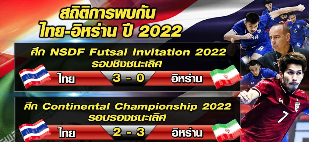 ผลงานการพบกันในปีนี้ 2022 แข่งกัน 2 นัด ในศึก NSDF Futsal Invitation 2022 นัดชิงชนะเลิศ ไทย ชนะ อิหร่าน 3-0 รายการ Continental Championship 2022 รอบรองชนะเลิศ ไทย แพ้ อิหร่าน 2-3 – สำนักข่าวไทย