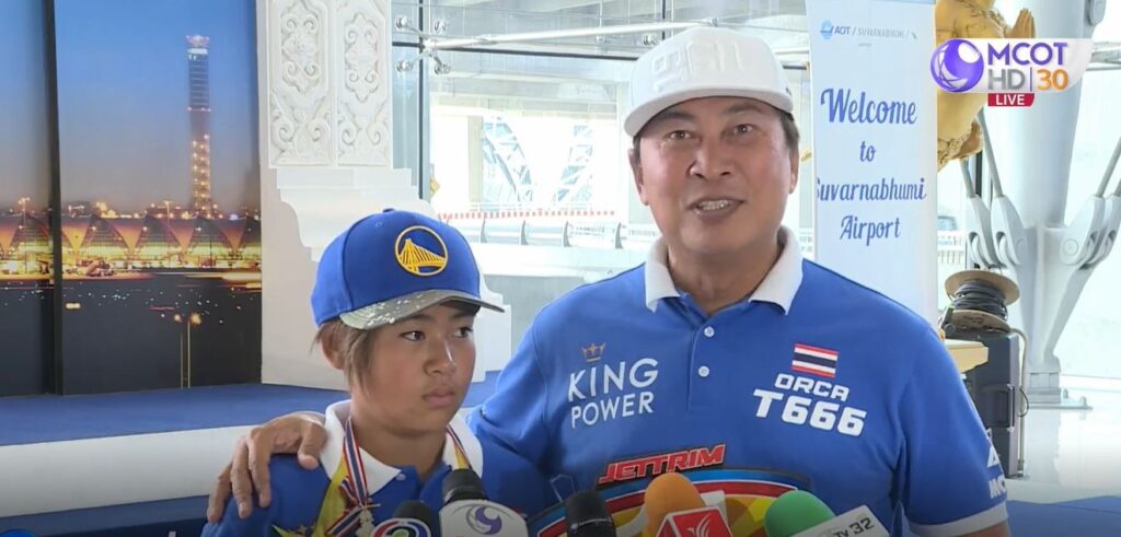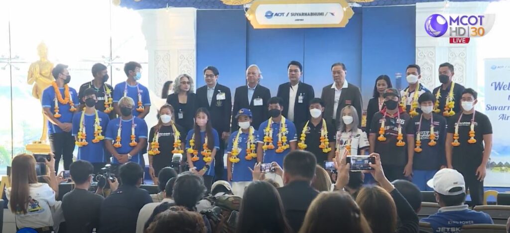 สนามบินสุวรรณภูมิ 14 ต.ค. – นักกีฬาเจ็ตสกีทีมชาติไทยหอบ 14 แชมป์โลก กลับถึงบ้าน พร้อมตั้งเป้าคว้าแชมป์ต่อเนื่องในศึกชิงแชมป์โลก สนาม 3 ที่พัทยา จ.ชลบุรี