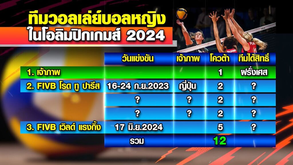 ทีมวอลเลย์บอลสาวไทย อันดับ 15 ของโลก หลังจากจบศึกวอลเลย์บอลหญิงชิงแชมป์โลก 2022 ที่ประเทศโปแลนด์และเนเธอร์แลนด์เป็นเจ้าภาพร่วมกัน ถือเป็นอีกหนึ่งความหวังของทัพนักกีฬาไทยที่จะคว้าโควตาไปลุยศึกโอลิมปิกเกมส์ 2024 ปารีสเกมส์ ที่ประเทศฝรั่งเศส ซึ่งเราจะมาดูรูปแบบและโอกาสที่ทีมลูกยางสาวไทยจะสร้างประวัติศาสตร์ไปลุยโอลิมปิกเกมส์สมัยแรก