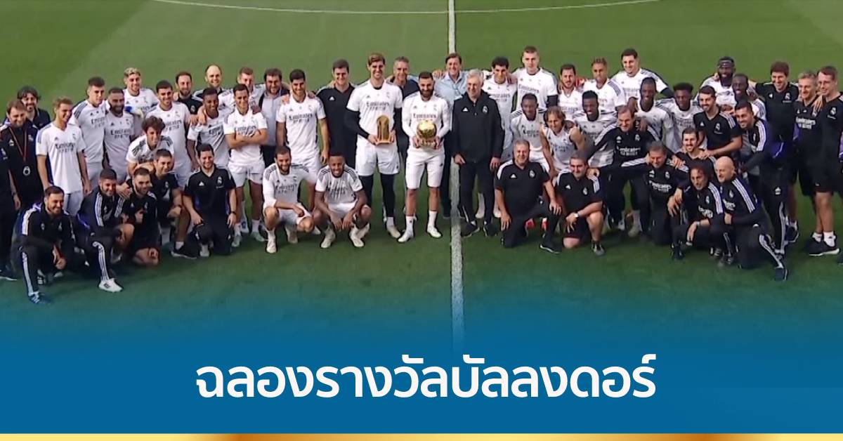 คาริม เบนเซมา กองหน้าทีมชาติฝรั่งเศสวัย 34 ปี ของ “ทีมราชันชุดขาว” เรอัล มาดริด ในศึกลา ลีกา สเปน ที่คว้ารางวัลบัลลงดอร์ หรือนักเตะยอดเยี่ยมแห่งปีสมัยแรกในชีวิต พร้อมกับ ธิโบต์ กูร์กตัวส์ ผู้รักษาประตูทีมชาติเบลเยียม ของเรอัล มาดริด ที่คว้ารางวัลผู้รักษาประตูยอดเยี่ยม ได้นำถ้วยรางวัลที่เพิ่งได้รับมาร่วมเฉลิมฉลองและถ่ายรูปเป็นที่ระลึกกับเพื่อนร่วมสโมสร และทีมงานสตาฟฟ์โค้ช หลังบินกลับจากฝรั่งเศส