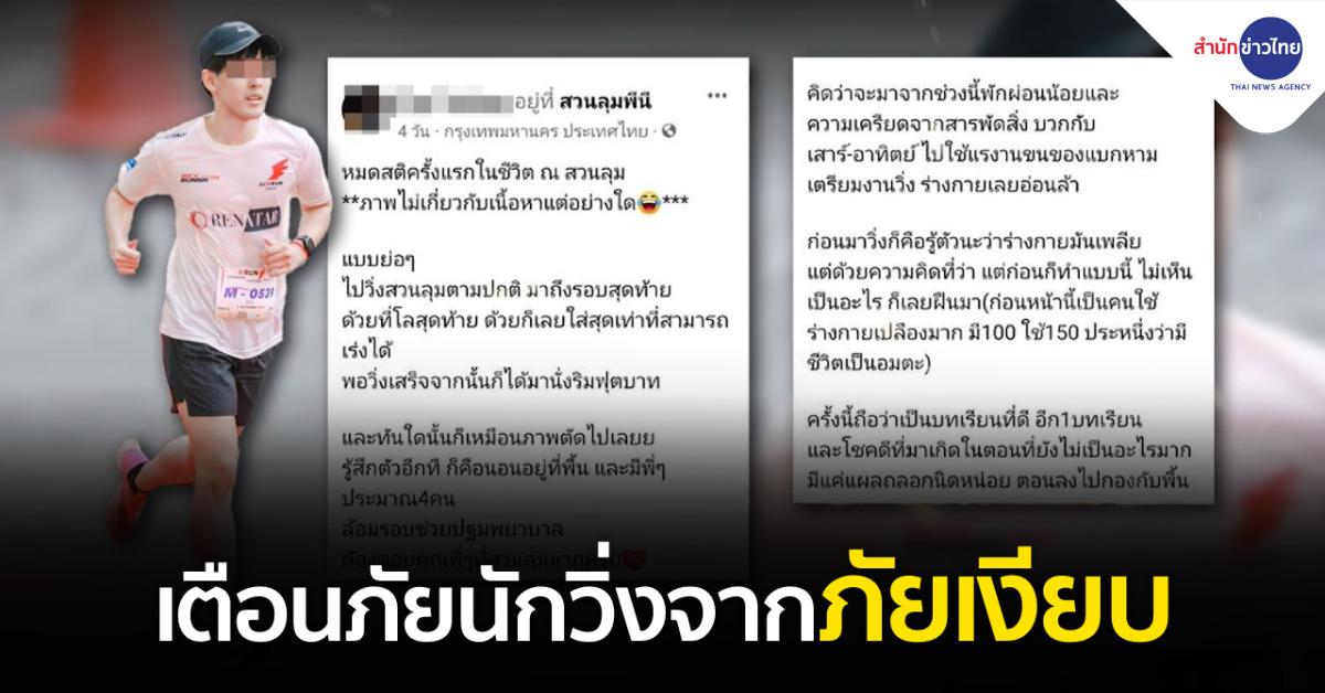 วงการวิ่งเริ่มกลับมาคึกคักอีกครั้ง จนทำให้นักวิ่งหน้าเก่าหน้าใหม่ไฟแรงที่ร้อนวิชา อยากจะลองของวิ่งด้วยเพจแรงๆ เหมือนอย่างนักวิ่งระดับโลก อยากให้จำเรื่องราวนี้เป็นบทเรียนเตือนสติ เพราะความโชคดีไม่ได้มีขึ้นบ่อย ถ้าเราไม่ระมัดระวังและไม่หมั่นดูแลสุขภาพร่างกายของตัวเองให้ดีอยู่เสมอ เหตุการณ์ที่ไม่มีใครอยากให้เกิดขึ้น ก็อาจจะเกิดซ้ำรอยอีกก็เป็นได้ .-สำนักข่าวไทย