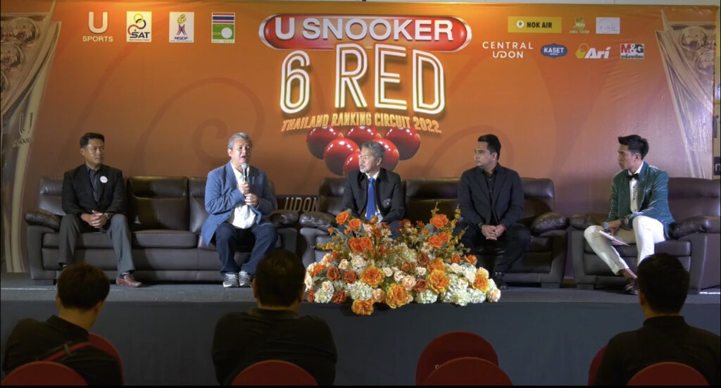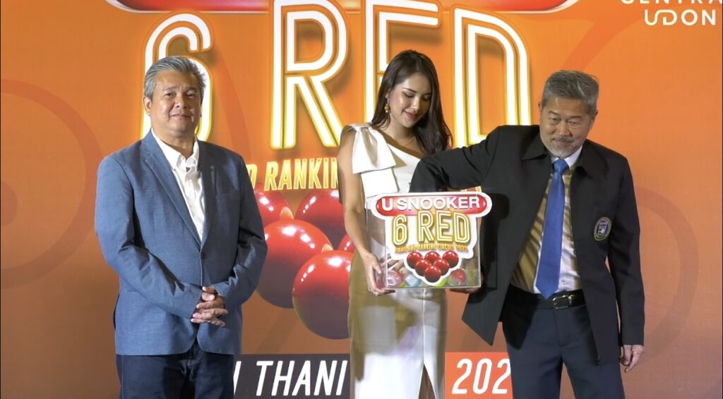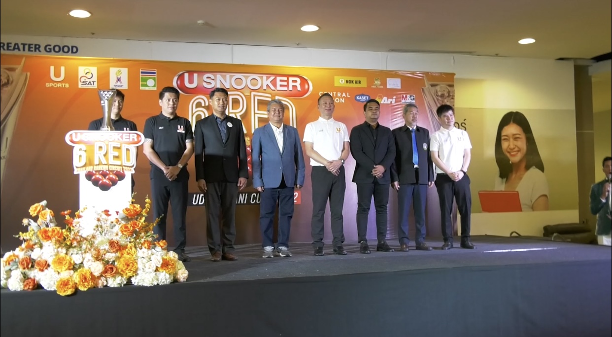 อุดรธานี-งานแถลงข่าวการจัดการแข่งขัน สนุกเกอร์ 6 แดง ไทยแลนด์ แร็งกิ้ง เซอร์ “USNOOKER 6 RED THAILAND RANKING CIRCUIT 2022” รอบสุดท้าย รายการที่ 2 ที่ฮอลล์ ภายในศูนย์การค้า เซ็นทรัลพลาซ่า จ.อุดรธานี โดยมีนายสุรเดช มั่นวิมล กรรมการผู้จัดการ บริษัท ยูสปอร์ต จำกัด พร้อมด้วย นายโกเมนทร์ ทีฆธนานนท์ ผู้จัดการโรงแรม เดอะไวท์ โฮเทล บาย เจริญศรี, นายอภิวิชญ์ สินสุวรรณเมธี คณะกรรมการบริหารสมาคมกีฬาบิลเลียดแห่งประเทศไทย และนายอนุชา เปรมเพชร ผู้จัดการทั่วไป ศูนย์การค้า เซ็นทรัลพลาซ่า จ.อุดรธานี ร่วมพิธีแถลงข่าว โดยภายในงานยังมีพิธีจับสลากประกบคู่การแข่งขันในรอบ 16 คนสุดท้าย และการแข่งขันสนุกเกอร์แมตช์พิเศษ ในโครงการ U ปัน YOU รับ ระหว่าง ทีมชาติไทย ที่มี “ต๋อง ศิษย์ฉ่อย”วัฒนา ภู่โอบอ้อม นักสนุกเกอร์ขวัญใจชาวไทยกับ “นุ้ก สงขลา”กฤษณัส เลิศสัตยาทร ประลองกับ ทีมชาต สปป.ลาว มี ท้าวสิทธิเดด สักเบี่ยง นักสนุกเกอร์ทีมชาติสปป.ลาว เจ้าของเหรียญทองประวัติศาสตร์ ซีเกมส์ กับ ‘ตาโร่ เวียงจันทร์’ดาวพระจันทร์ พุทธบรรดิษ