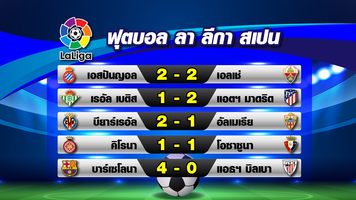 ผลฟุตบอลลา ลีกา สเปน คู่ที่น่าสนใจ เรอัล เบติส แพ้ แอตเลติโก มาดริด 1-2, บียาร์เรอัล ชนะ อัลเมเรีย 2-1, บาร์เซโลนา ชนะ แอธเลติก บิลเบา 4-0