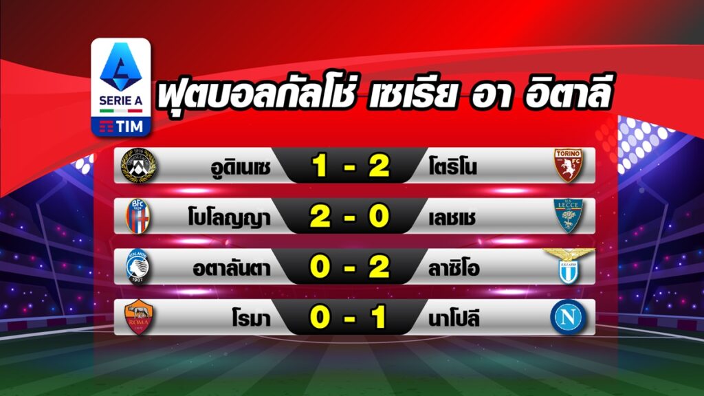 ผลฟุตบอลกัลโช่ เซเรีย อา อิตาลี คู่ที่น่าสนใจ อตาลันตา แพ้ ลาซิโอ 0-2, โรมา แพ้ นาโปลี 0-1. – สำนักข่าวไทย