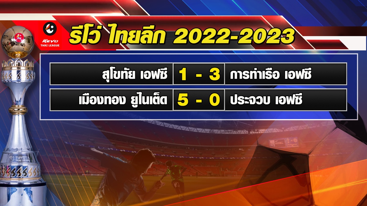 รีโว่ ไทยลีก 2022-2023 อีก 2 คู่ สุโขทัย เอฟซี แพ้ การท่าเรือ เอฟซี 1-3, เมืองทอง ยูไนเต็ด ชนะ ประจวบ เอฟซี 5-0. – สำนักข่าวไทย