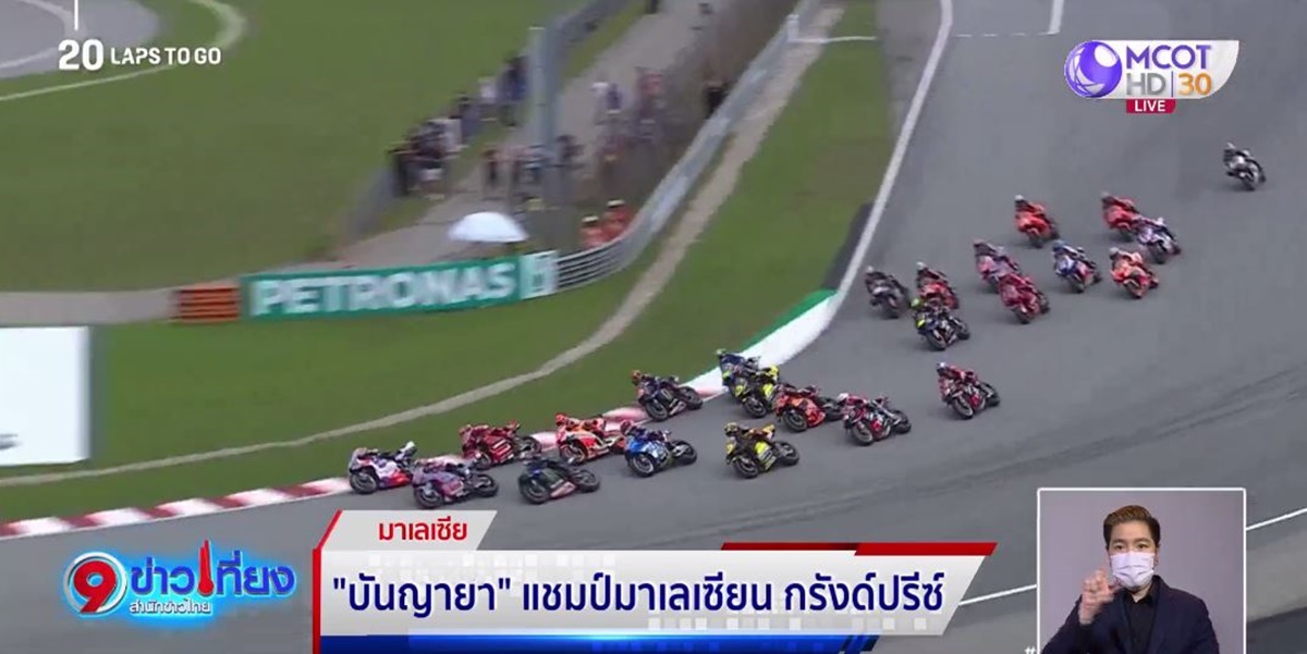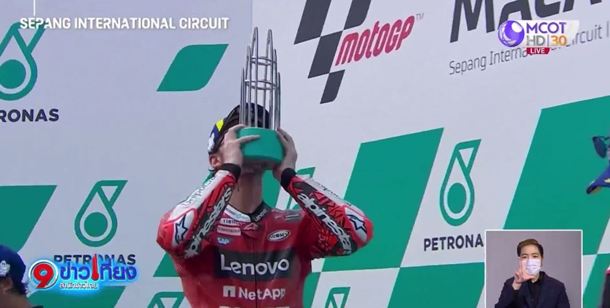 จักรยานยนต์ทางเรียบชิงแชมป์โลก ศึก “มาเลเซียน กรังด์ปรีซ์” ที่ประเทศมาเลเซีย รุ่นโมโตจีพี ฟรานเชสโก บันญายา นักบิดชาวอิตาเลียนจากทีมดูคาติ จ่อคว้าแชมป์โลกสมัยแรก หลังคว้าแชมป์สนามนี้ ด้วยเวลา 40 นาที 14.332 วินาที เฉือน เอเนีย บาสเตียนินี เพื่อนร่วมทีม เพียง 0.27 วินาที คว้าแชมป์สนามที่ 7 ในฤดูกาลนี้ มีเพิ่มเป็น 258 แต้ม ทิ้งห่าง ฟาบิโอ กวาร์ตาราโร นักบิดแชมป์โลกชาวฝรั่งเศส 23 แต้ม ก่อนลงแข่งขันสนามสุดท้ายในศึก “บาเลนเซีย กรังด์ปรีซ์” – สำนักข่าวไทย