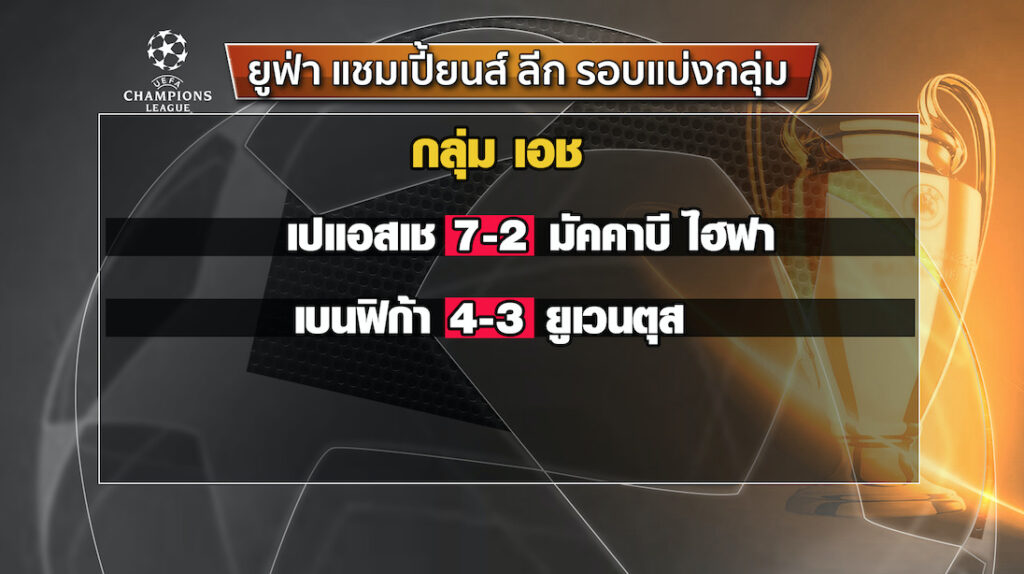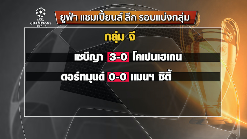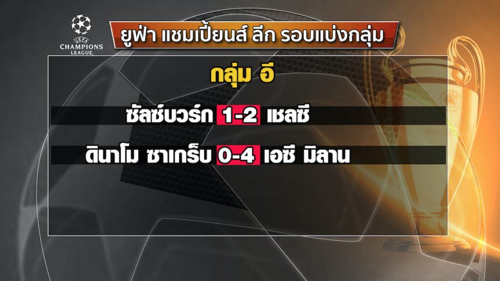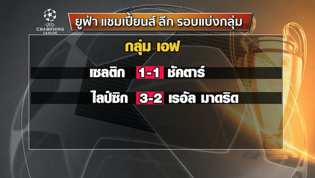 ส่วนผลการแข่งขันเมื่อคืนนี้ กลุ่มอี. ซัลซ์บวร์ก แพ้ เชลซี 1-2, ดินาโม ซาเกร็บ แพ้ เอซี มิลาน 0-4, กลุ่มเอฟ. เซลติก เสมอ ชัคตาร์ 1-1, ไลป์ซิก ชนะ เรอัล มาดริด 3-2 กลุ่มจี. เซบีญา ชนะ โคเปนเฮเกน 3-0, ดอร์ทมุนด์ เสมอ แมนฯ ซิตี 0-0 กลุ่มเอช. เปแอสเช ชนะ มัคคาบี ไฮฟา 7-2, เบนฟิกา 4-3 ยูเวนตุส .-สำนักข่าวไทย